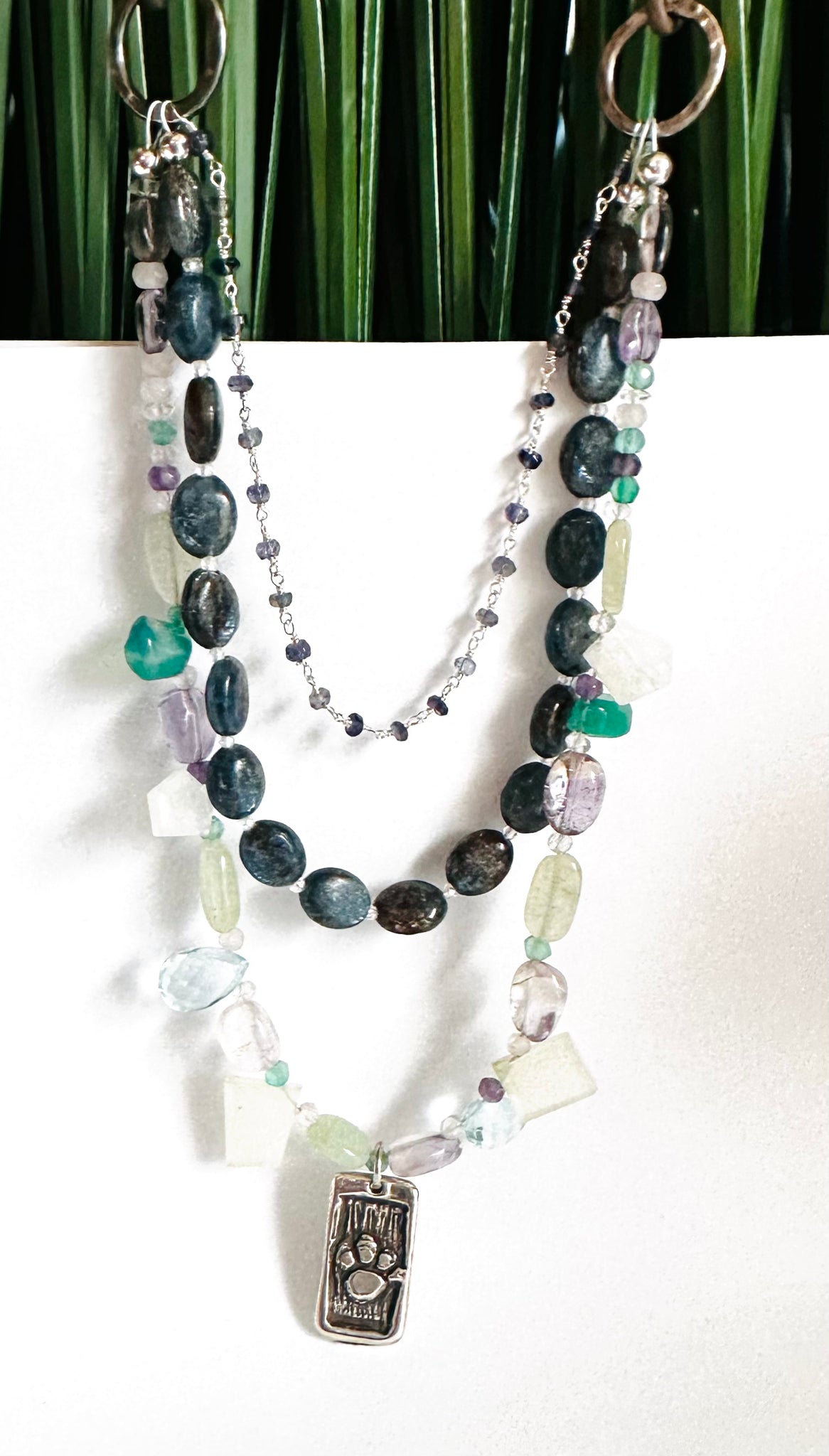 Elevate your energy with this stunning triple-strand gemstone necklace, designed to harmonize mind, body, and spirit. Featuring delicate iolite faceted beads wire-wrapped in sterling silver, soothing oval blue kyanite stones, and a vibrant multi-gemstone strand showcasing amethyst, rose quartz, moonstone, emerald, and aquamarine. The centerpiece—a solid sterling silver paw pendant with sun rays carved on the back—symbolizes strength and protection. Hand-crafted with genuine Greek leather and sterling silver accents, this 18-inch necklace combines artisanal beauty with meaningful intention. Perfect for layering or wearing solo, it's a versatile piece that speaks to your unique style and spiritual journey.