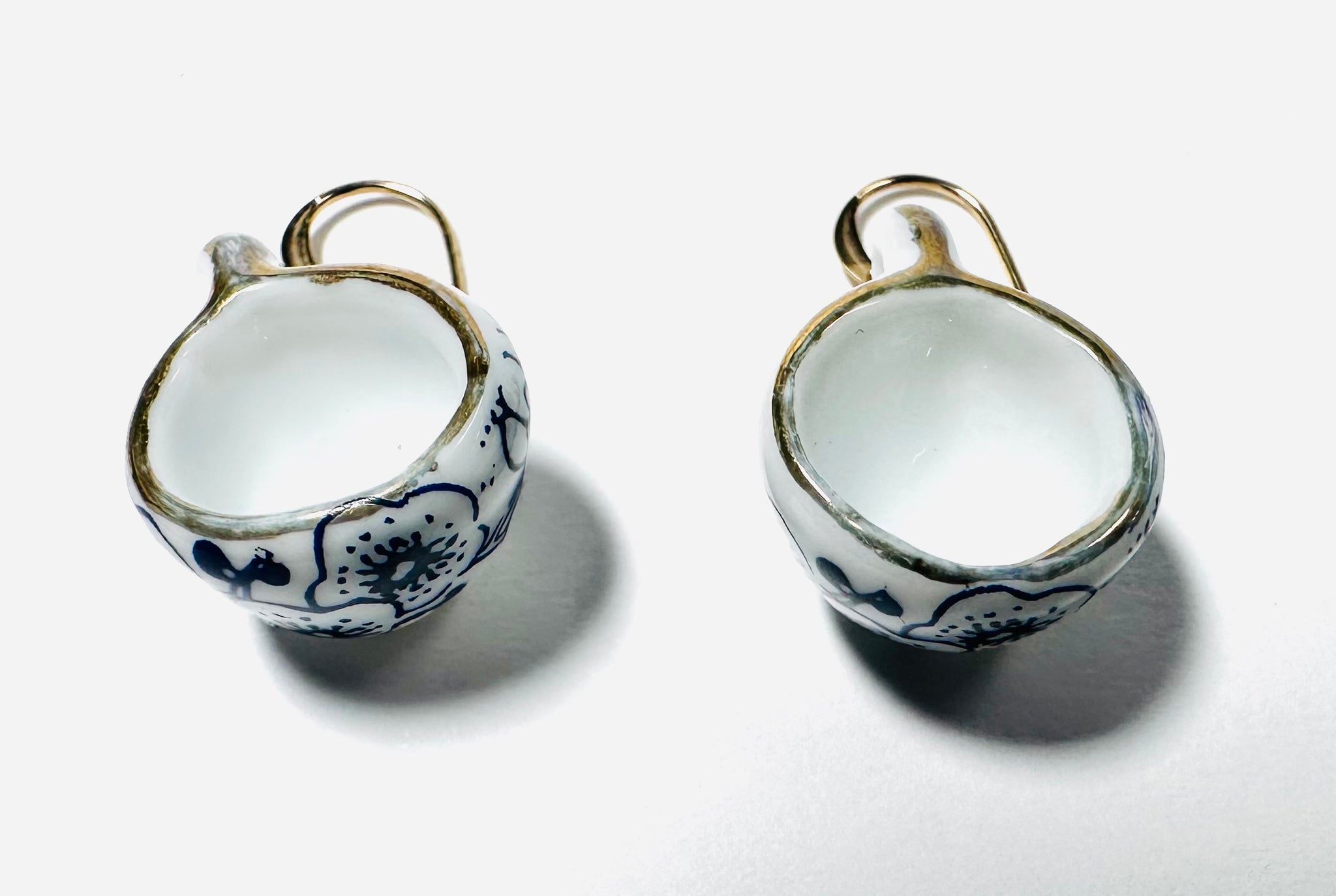 Tiny porcelain teacup adorned with either blue or pink printed floral designs. Choose gold fill or Sterling silver ear wires for the blue prints. Absolutely adorable! 1” long.