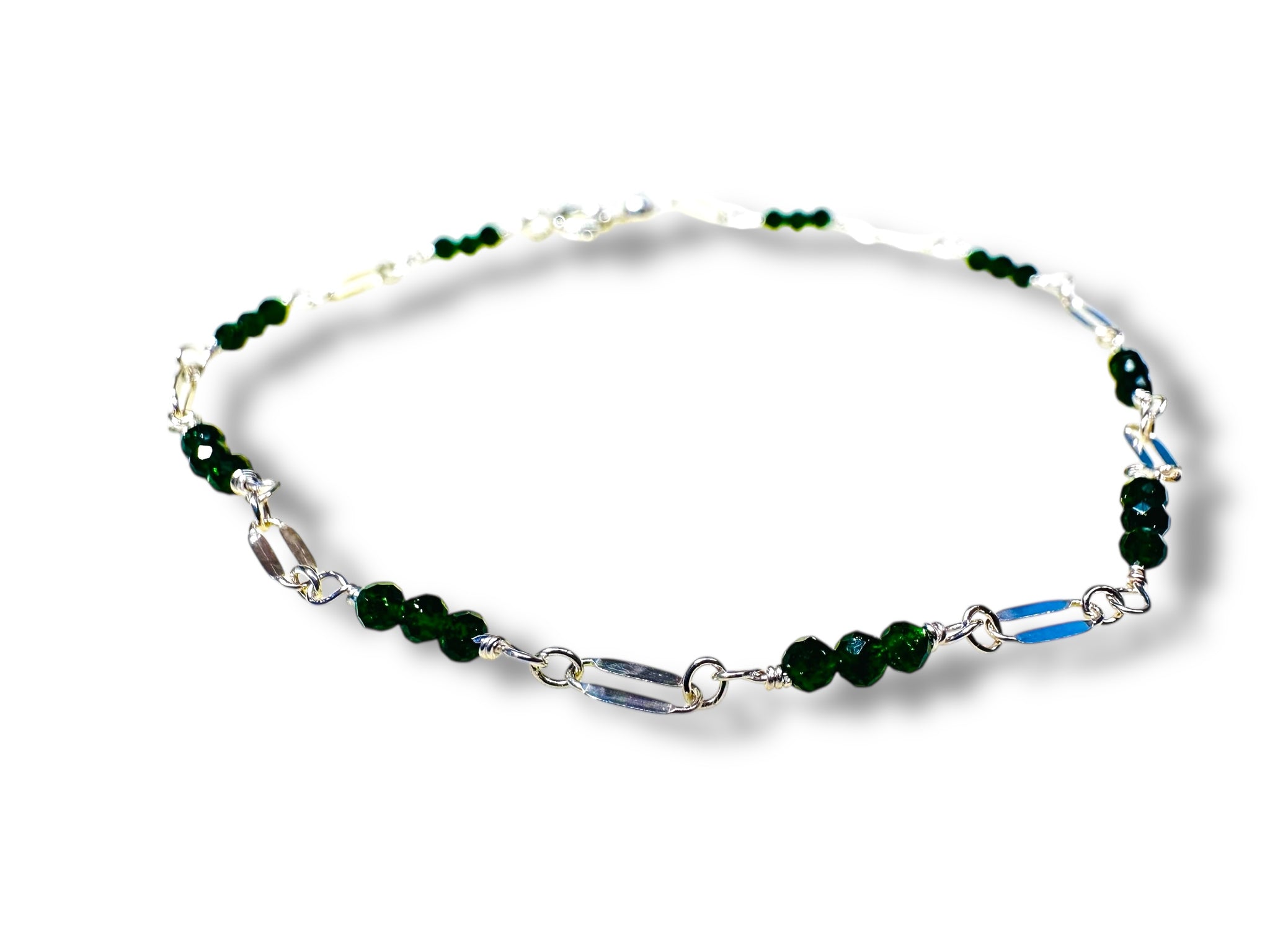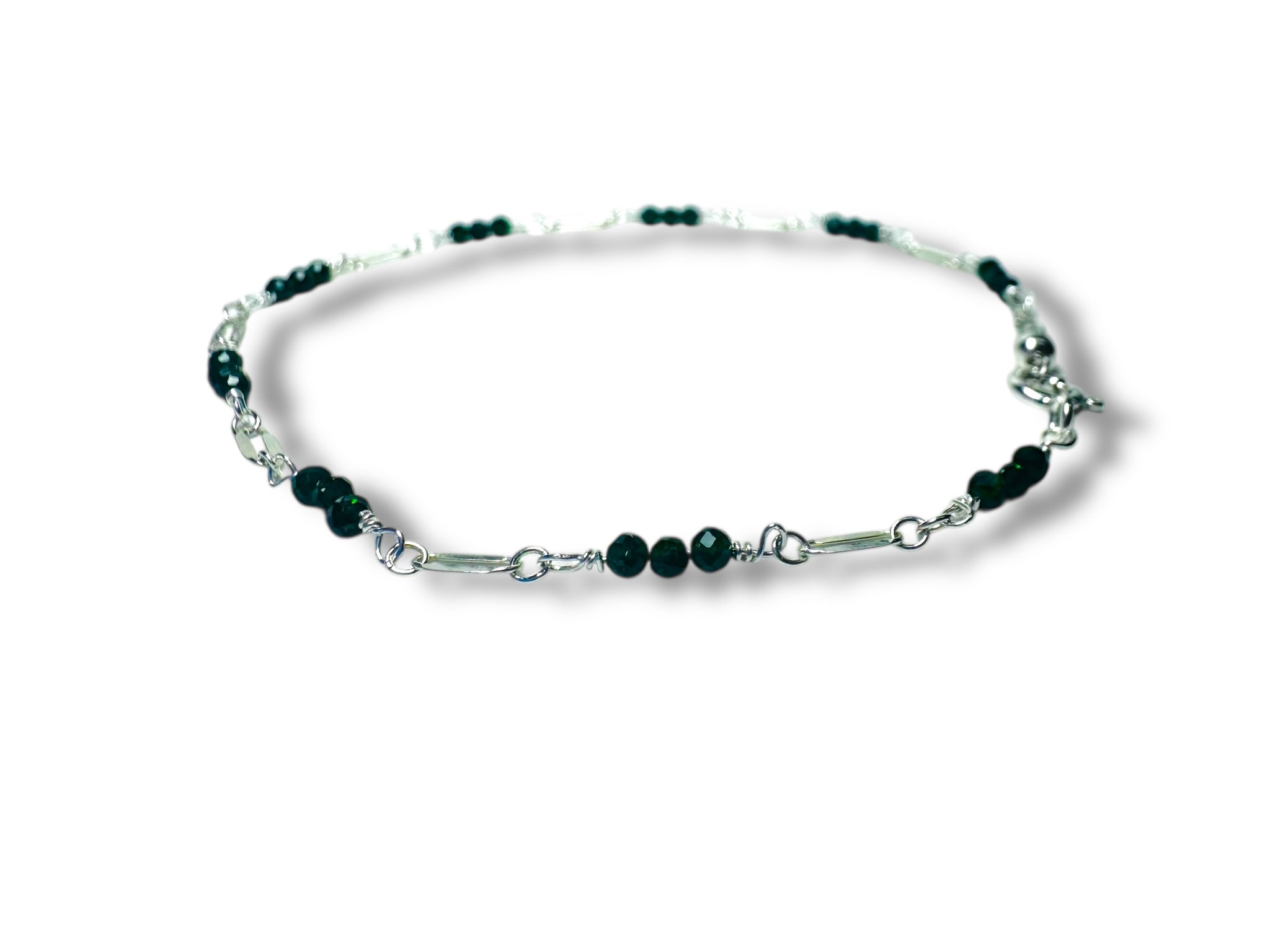 Discover the unique beauty of our Dainty Green Goldstone Gemstone Bracelet. This 7.25" long bracelet features genuine 2mm green goldstone beads wire wrapped between dainty silver chain, creating a sparkly and elegant look. With a spring ring clasp, this bracelet is both stylish and secure. Enhance your outfit with the natural allure of green goldstone.