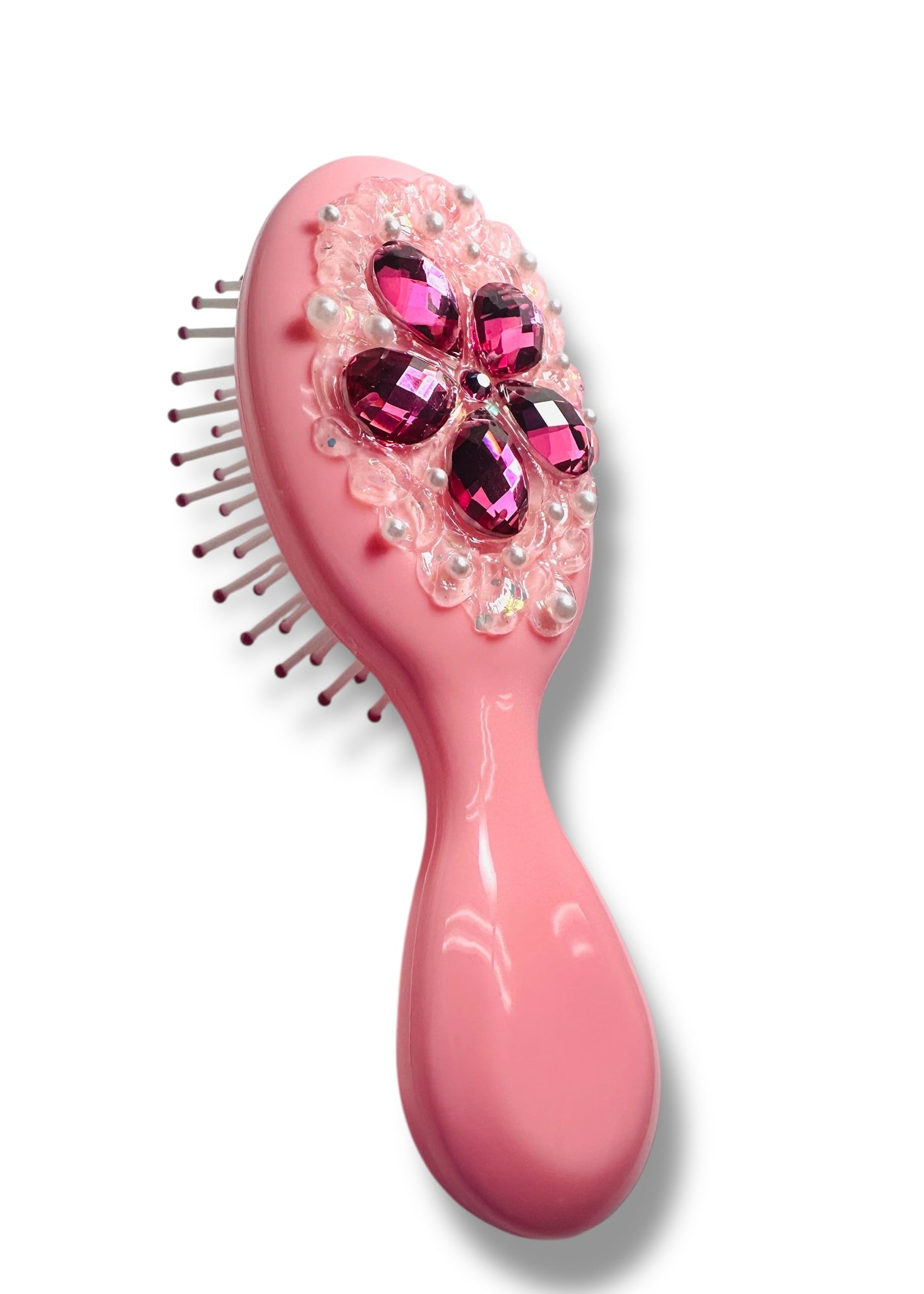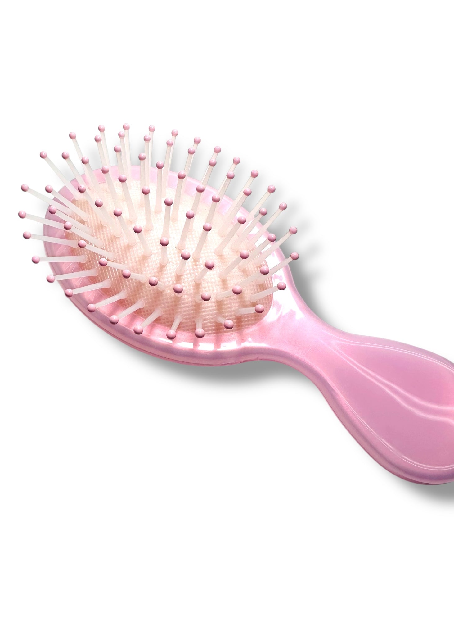Pocket size hair brush in pink. about 5” long and 2” wide.