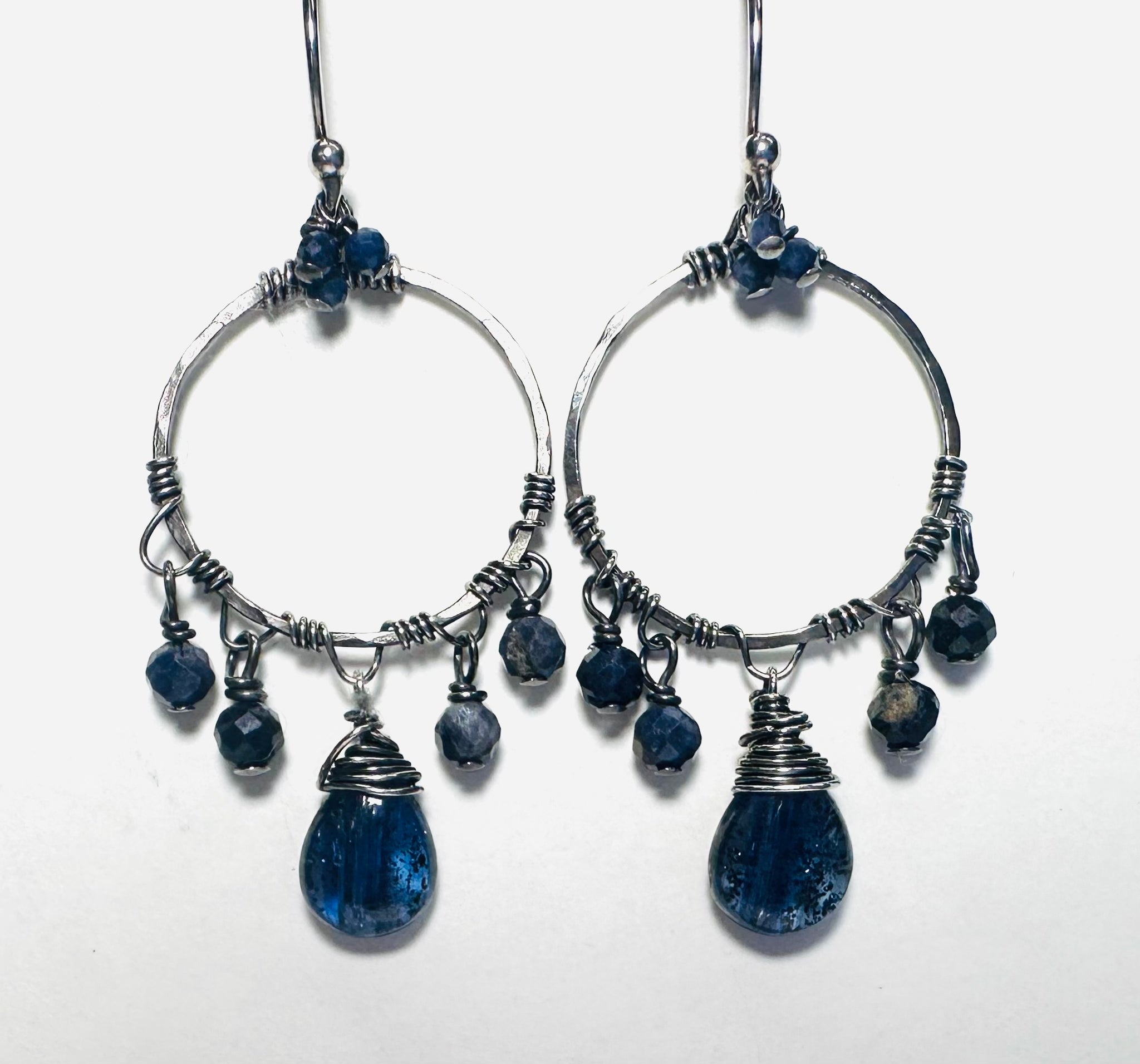 1.5” long earrings. Tiny sodalite beads wire wrapped with sterling on hand soldered and textured circle frame. Blue Kyanite teardrop bead in center.