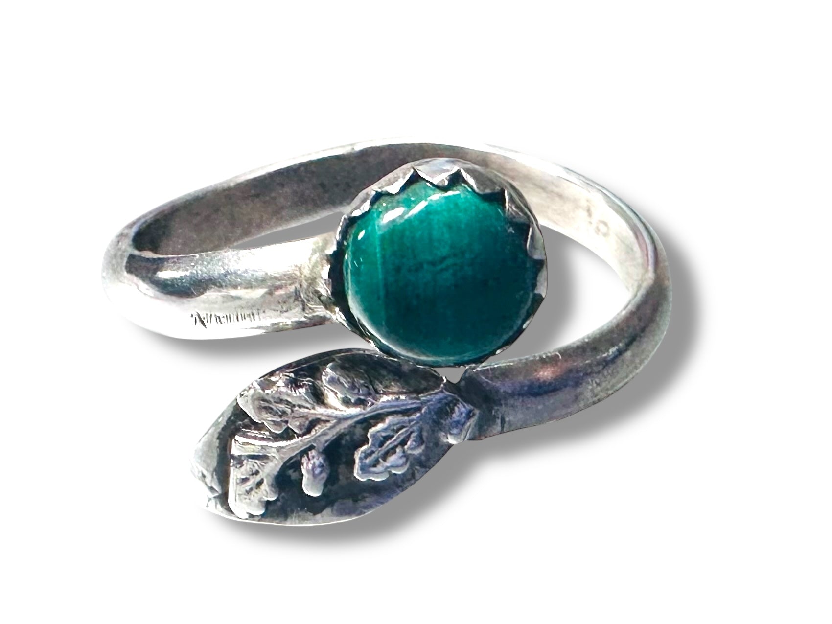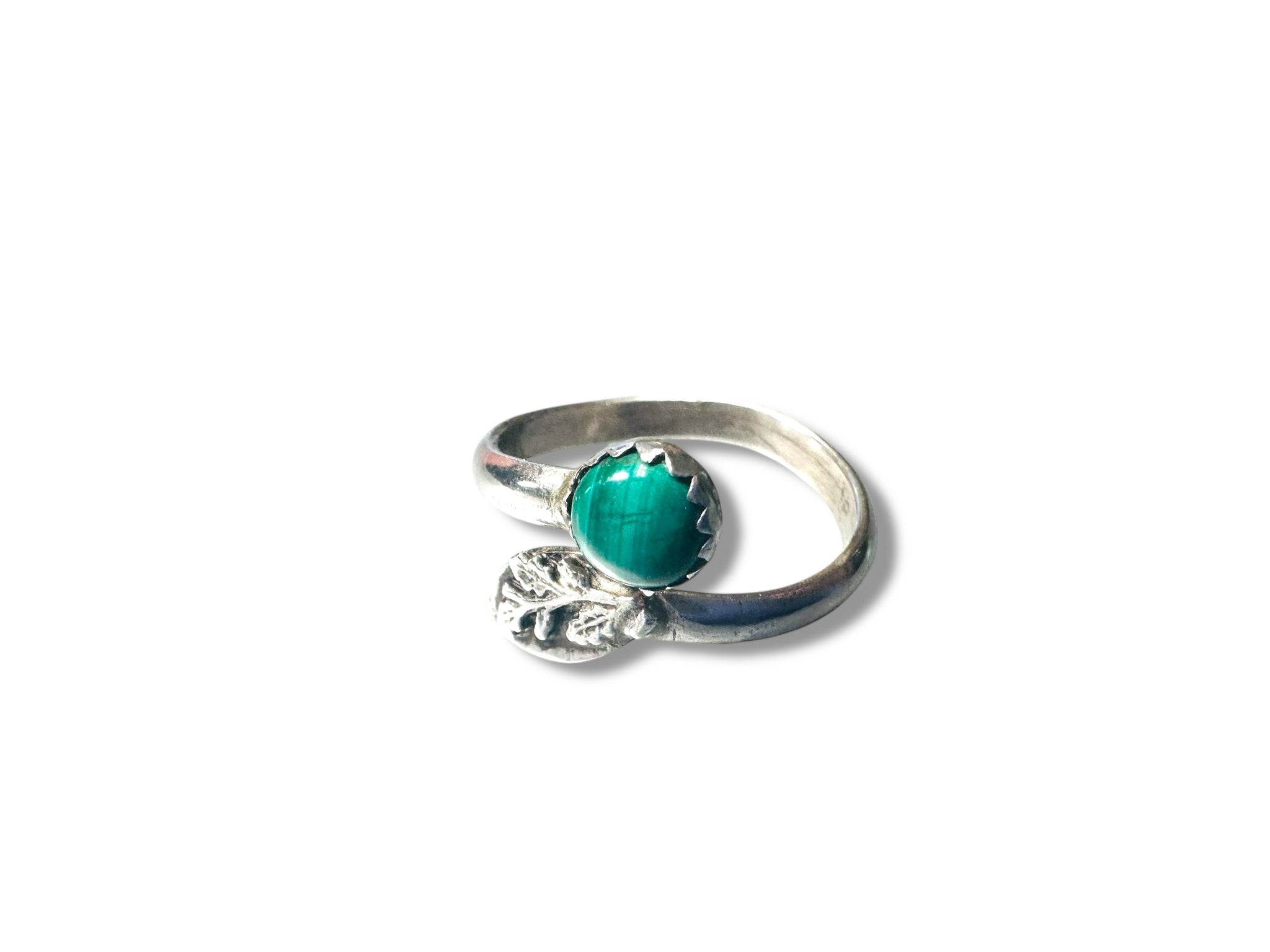 Adjustable ring has a 6mm genuine malachite stone set with a decorative leaf on the other end. Featuring an adjustable design, this ring is adorned with a genuine 6mm malachite stone and finished with a delicate leaf detail. Crafted with quality materials, this ring offers both style and versatility for any occasion.