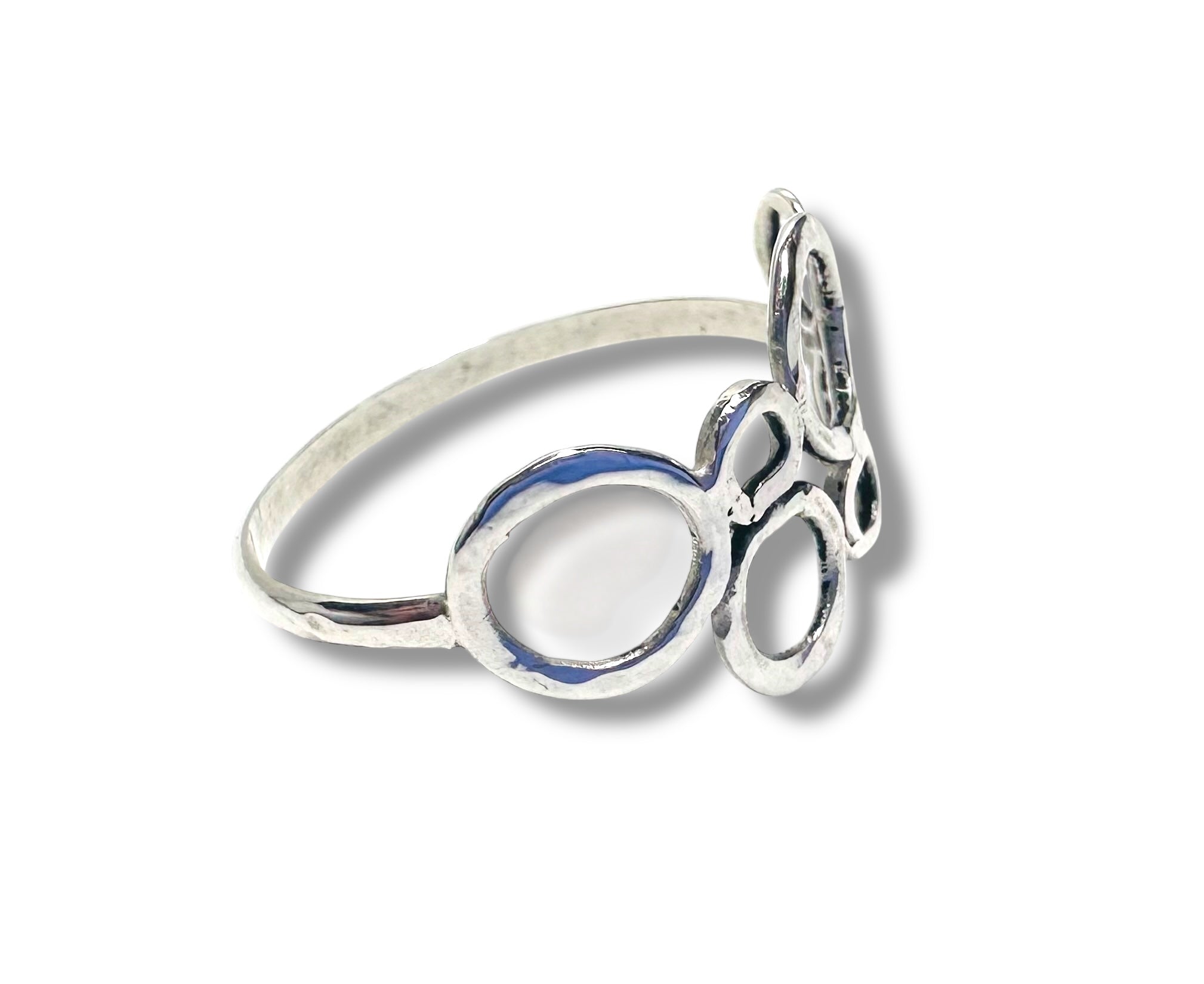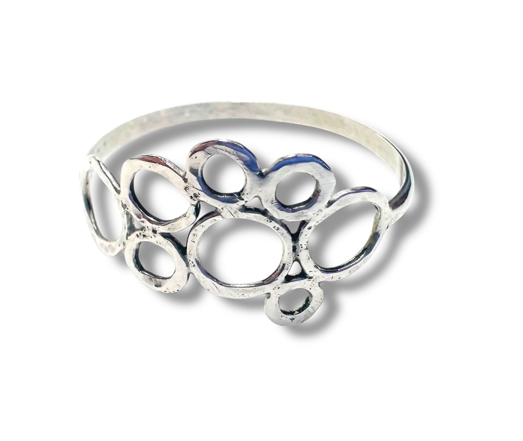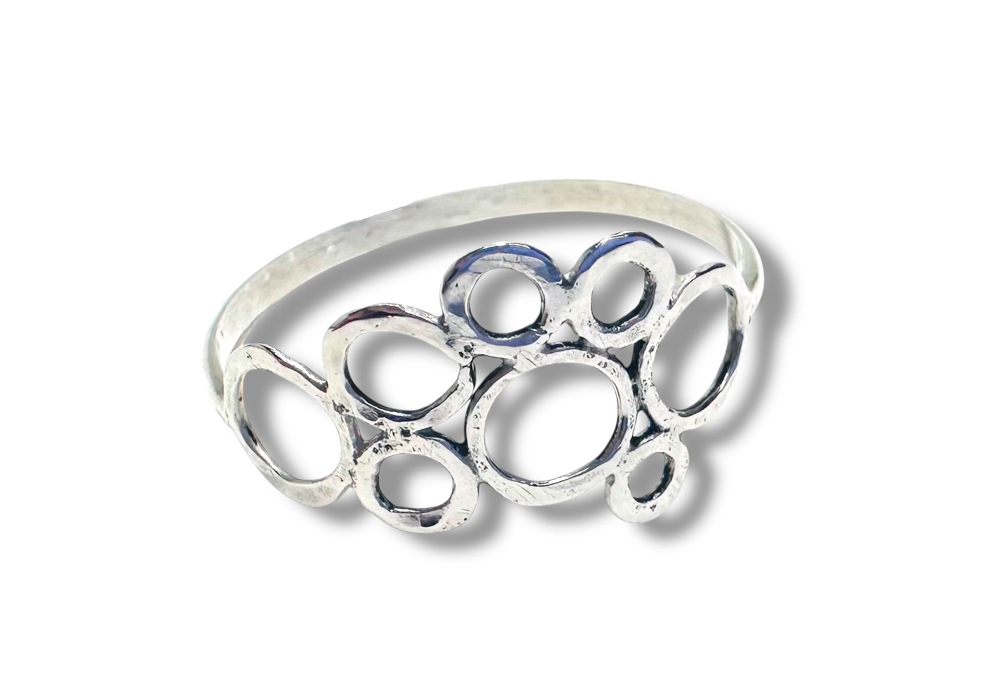 Hand soldered circles attached to a solid silver band. Lightweight and easy to wear. Expertly crafted for style and durability, this Silver Bubble Ring boasts hand soldered circles delicately attached to a sturdy silver band. Its lightweight design offers effortless wearability, making it a perfect addition to any outfit.