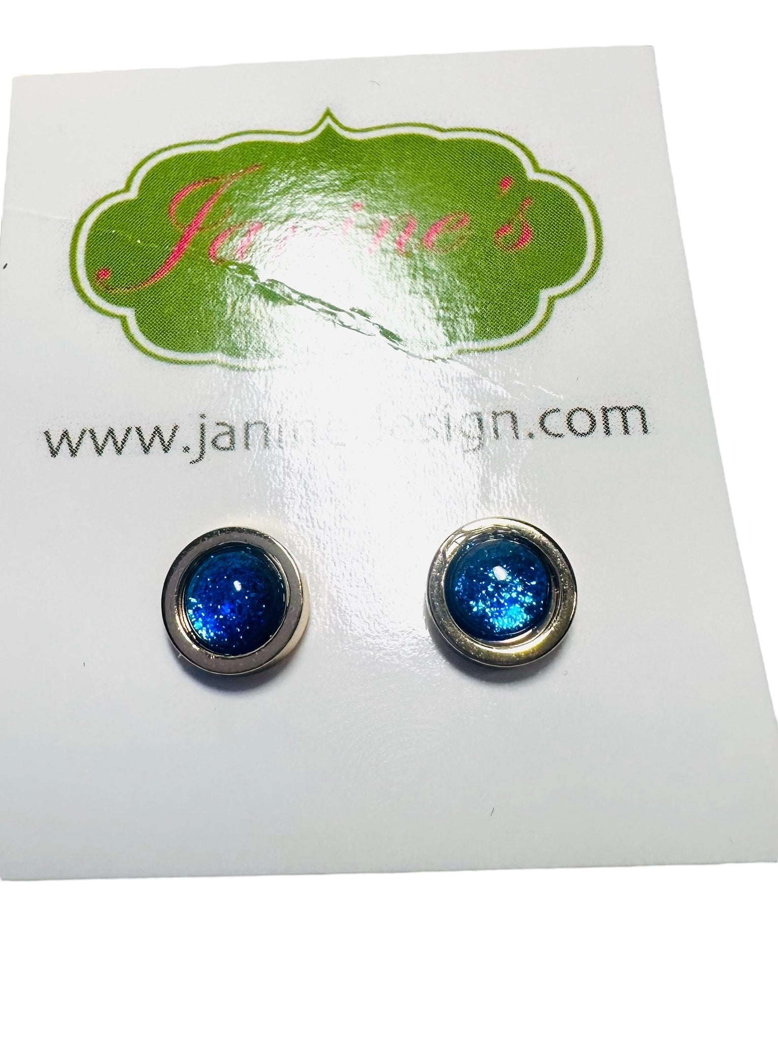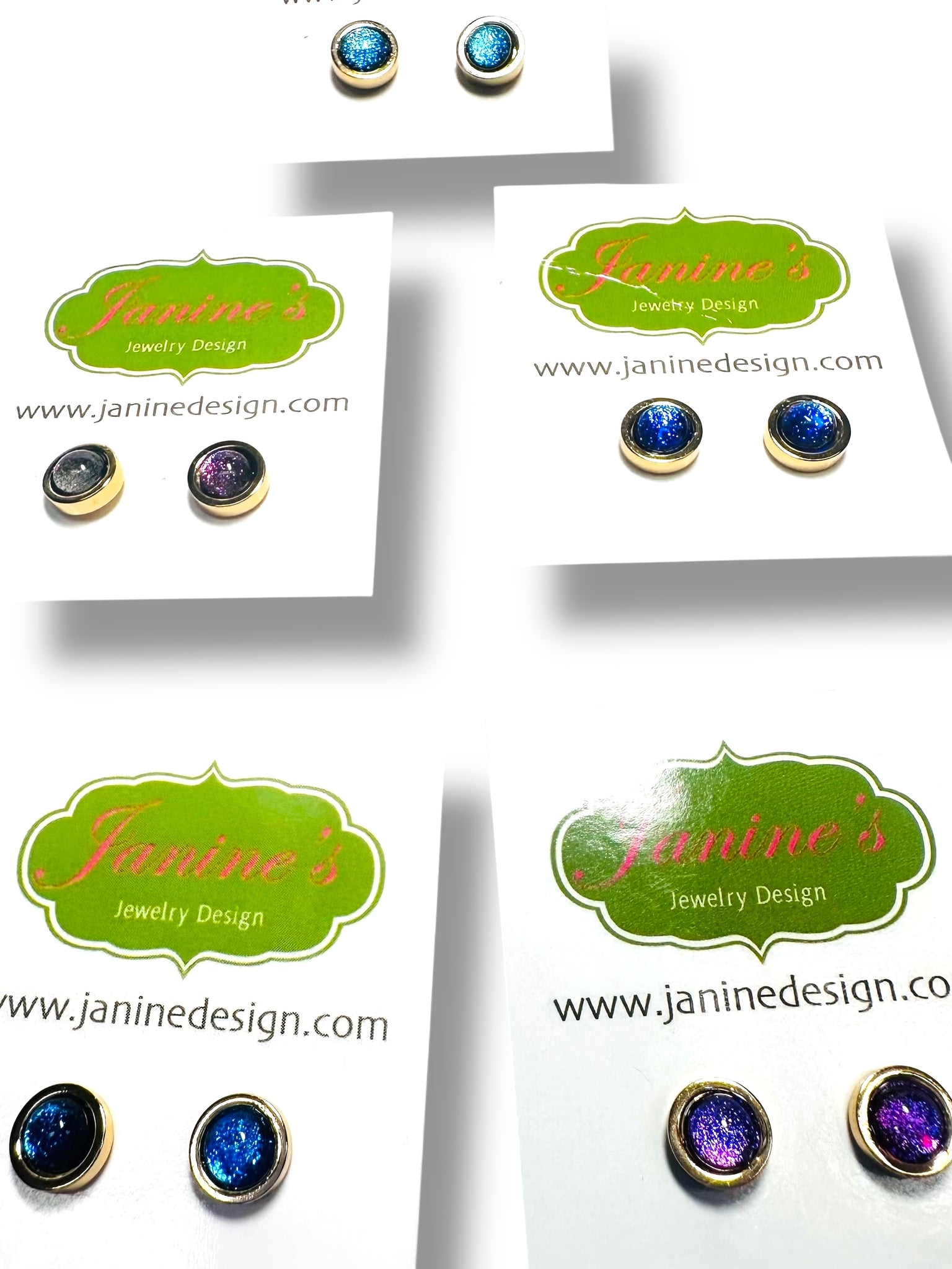 Resin glitter cabochon studs in stainless steel settings. Add a touch of sparkle and versatility to your collection with Glitter Color Changing Studs. These unique earrings feature a glitter stud that changes color depending on the lighting, giving you a different look each time you wear them. Perfect for adding a fun and trendy element to any outfit.