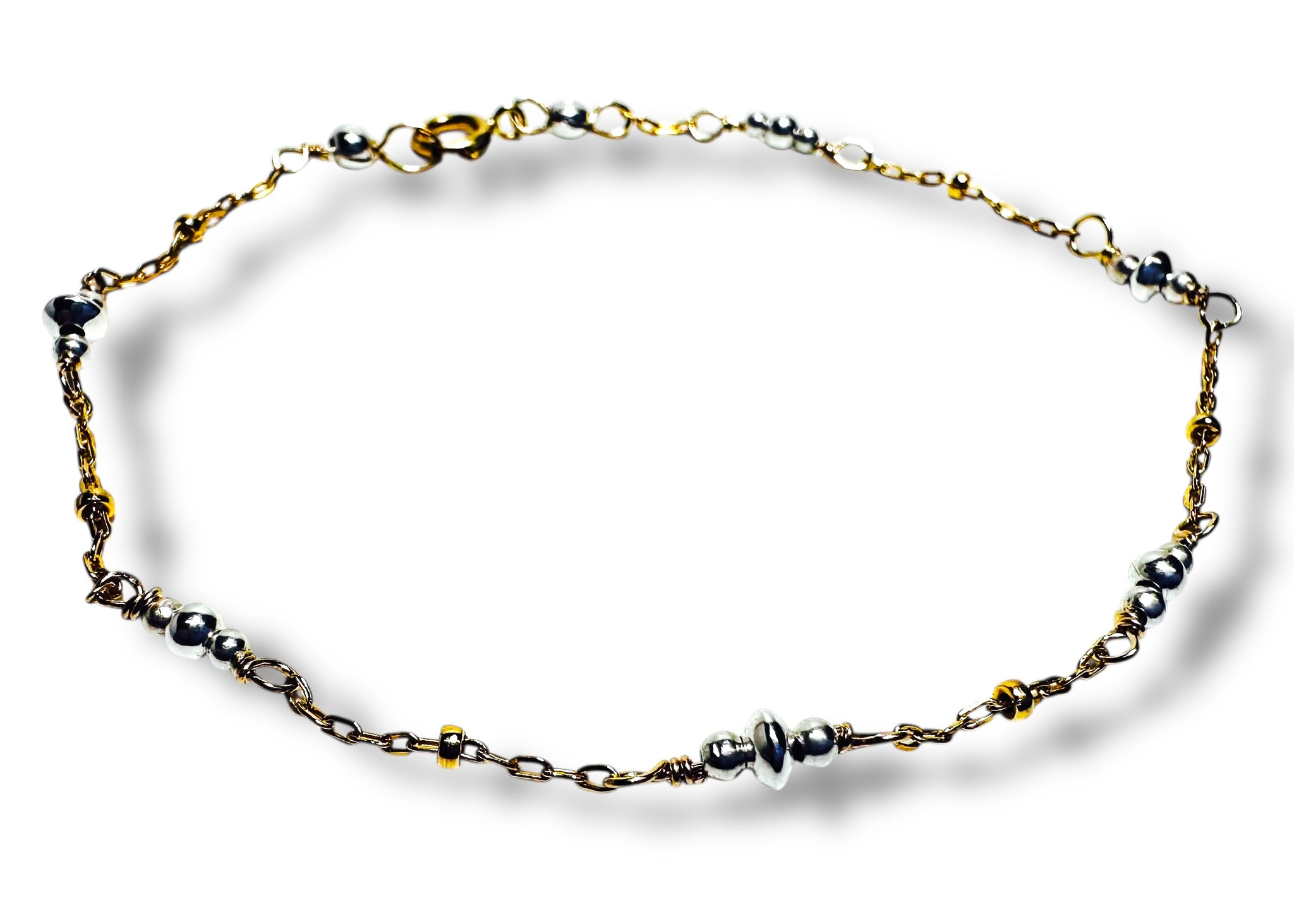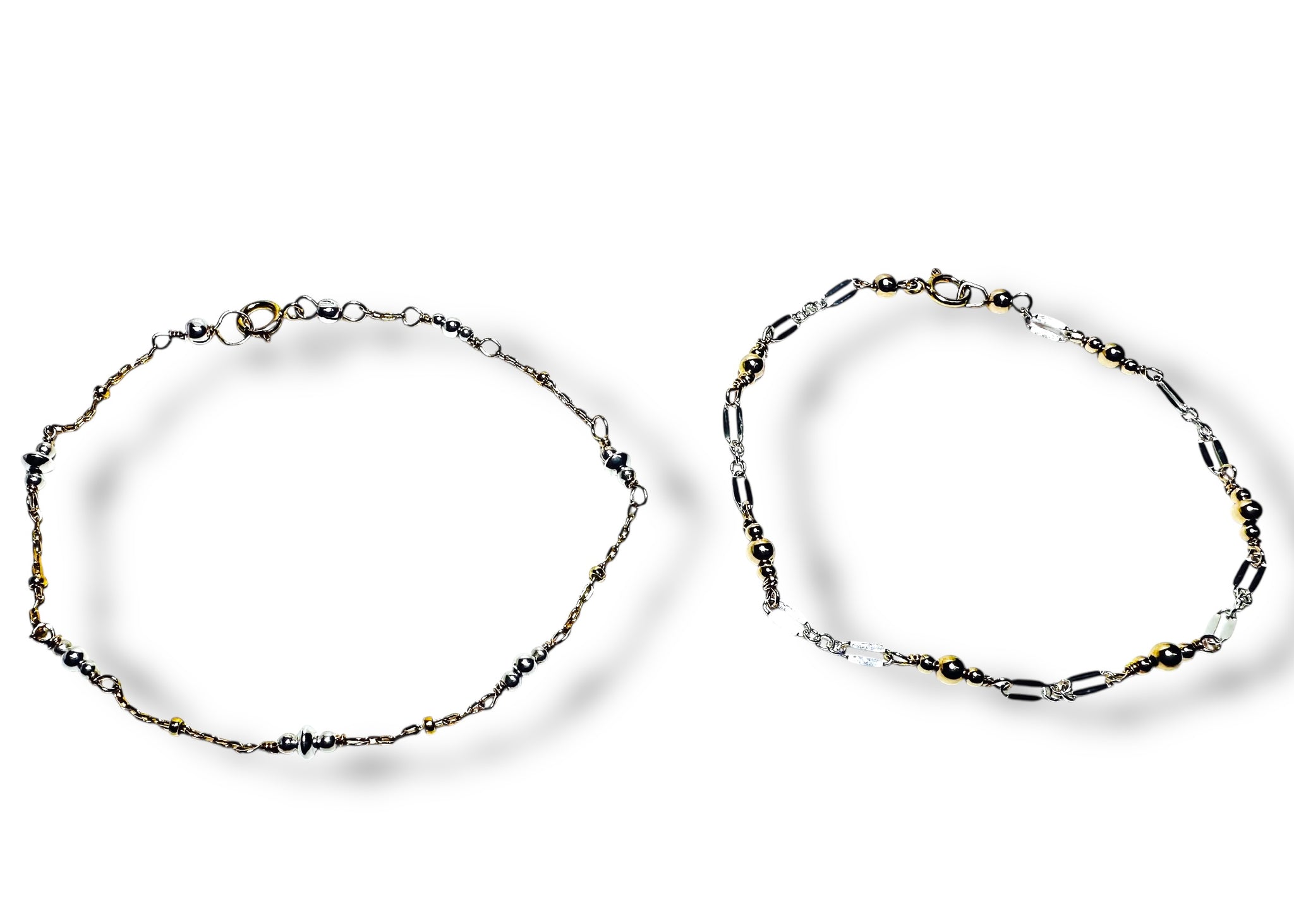 Between 7”-8” long beaded gemstones mixed with either gold filled or sterling.