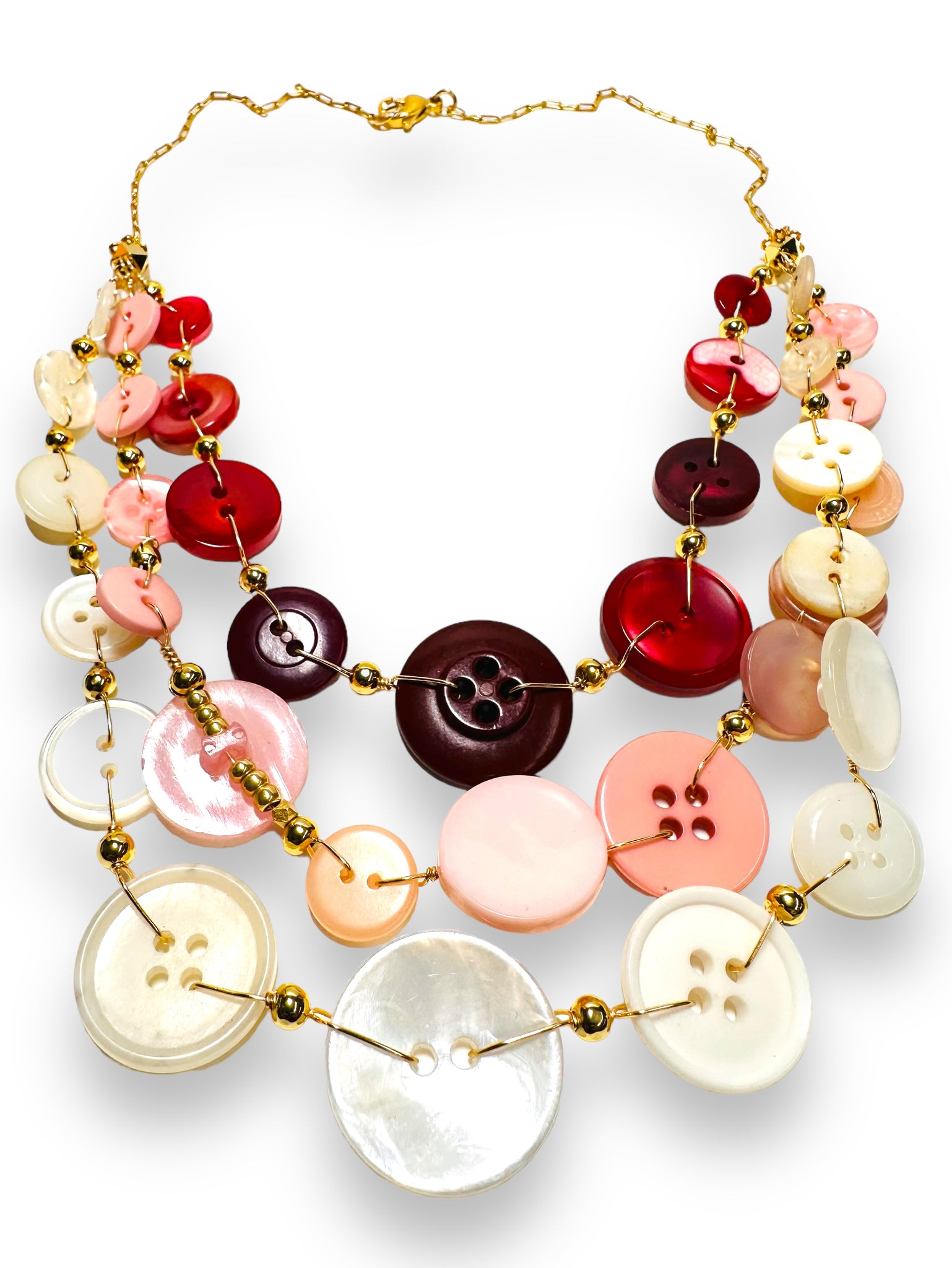 16” long button necklace made with plated silver wire and chain. Vintage buttons in various colors of creamy white, pink and burgundy. Gold plated brass chain and accent beads.