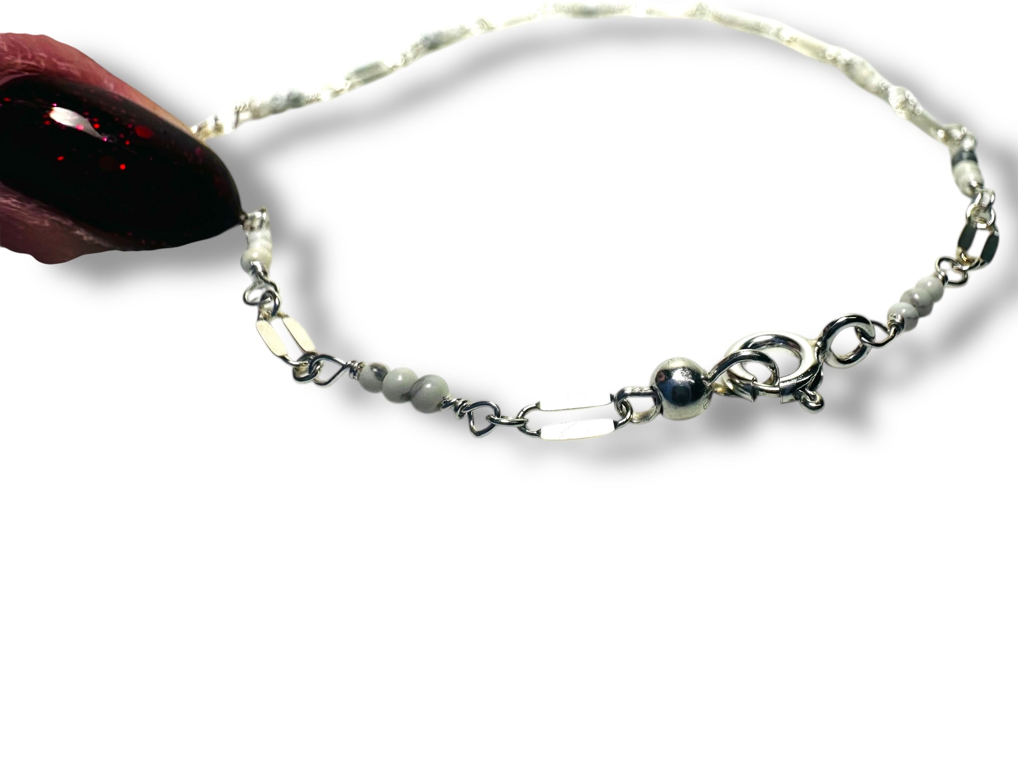Expertly crafted with delicate sterling silver and smooth 2mm Howlite beads, this dainty bracelet measures 7.5 inches long. The gentle energy of Howlite is believed to aid in stress relief and promote calmness and clarity. Experience the benefits of this gemstone with our unique wire wrapped design.