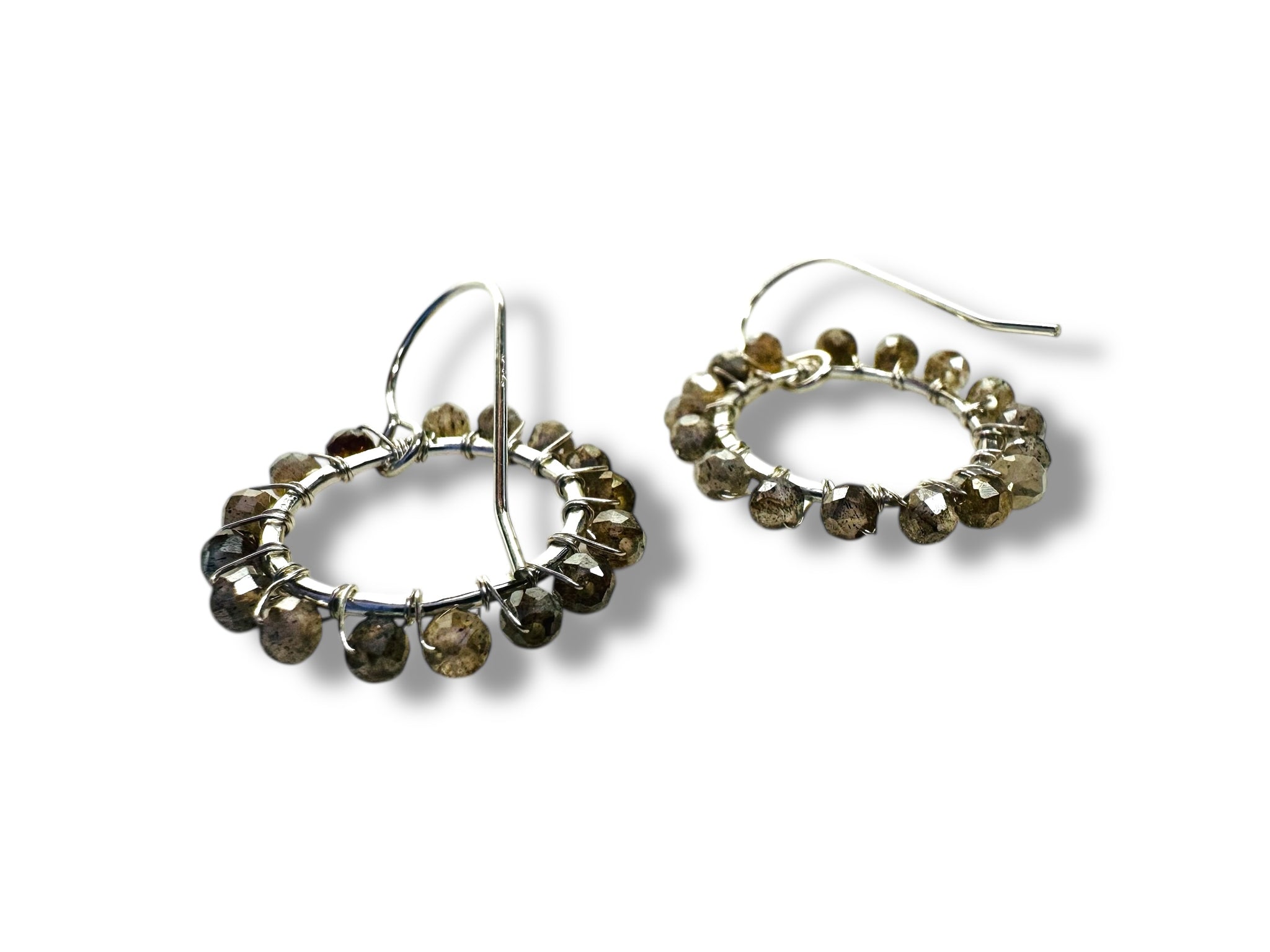 Elevate your everyday elegance with these captivating beaded hoop earrings, featuring lustrous metallic-coated moonstone beads in warm, enchanting tones. Each delicate 3-4mm faceted bead is meticulously wire-wrapped onto a sterling silver circle frame, creating a sophisticated interplay of light and dimension. Suspended from genuine sterling silver ear wires, these earrings offer both timeless beauty and reliable comfort for all-day wear. Perfect for adding a touch of refined sparkle to any occasion.