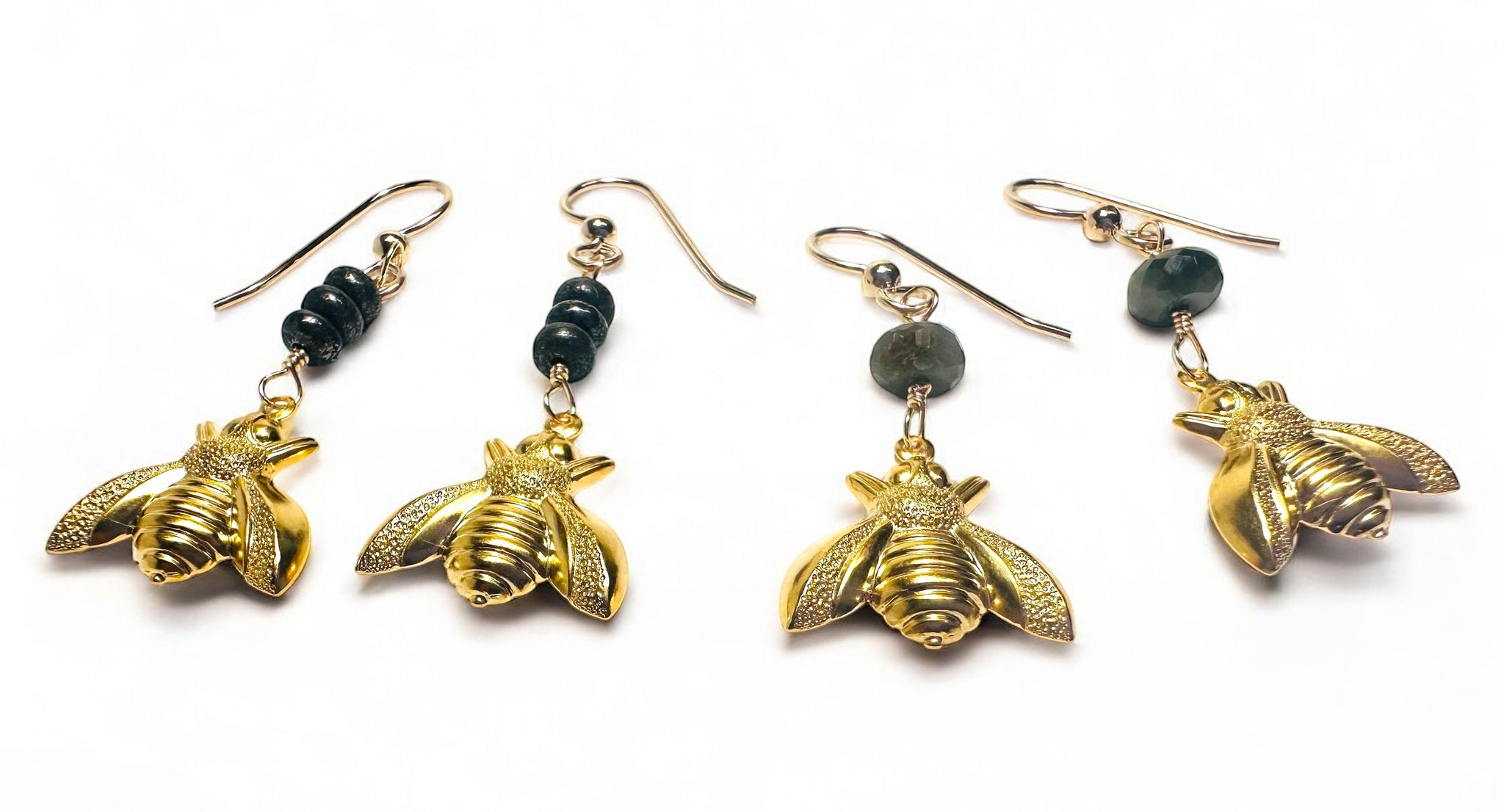 brass stamped bee charm attached to brass wire wrapped gemstone. Gold filled ear wires.