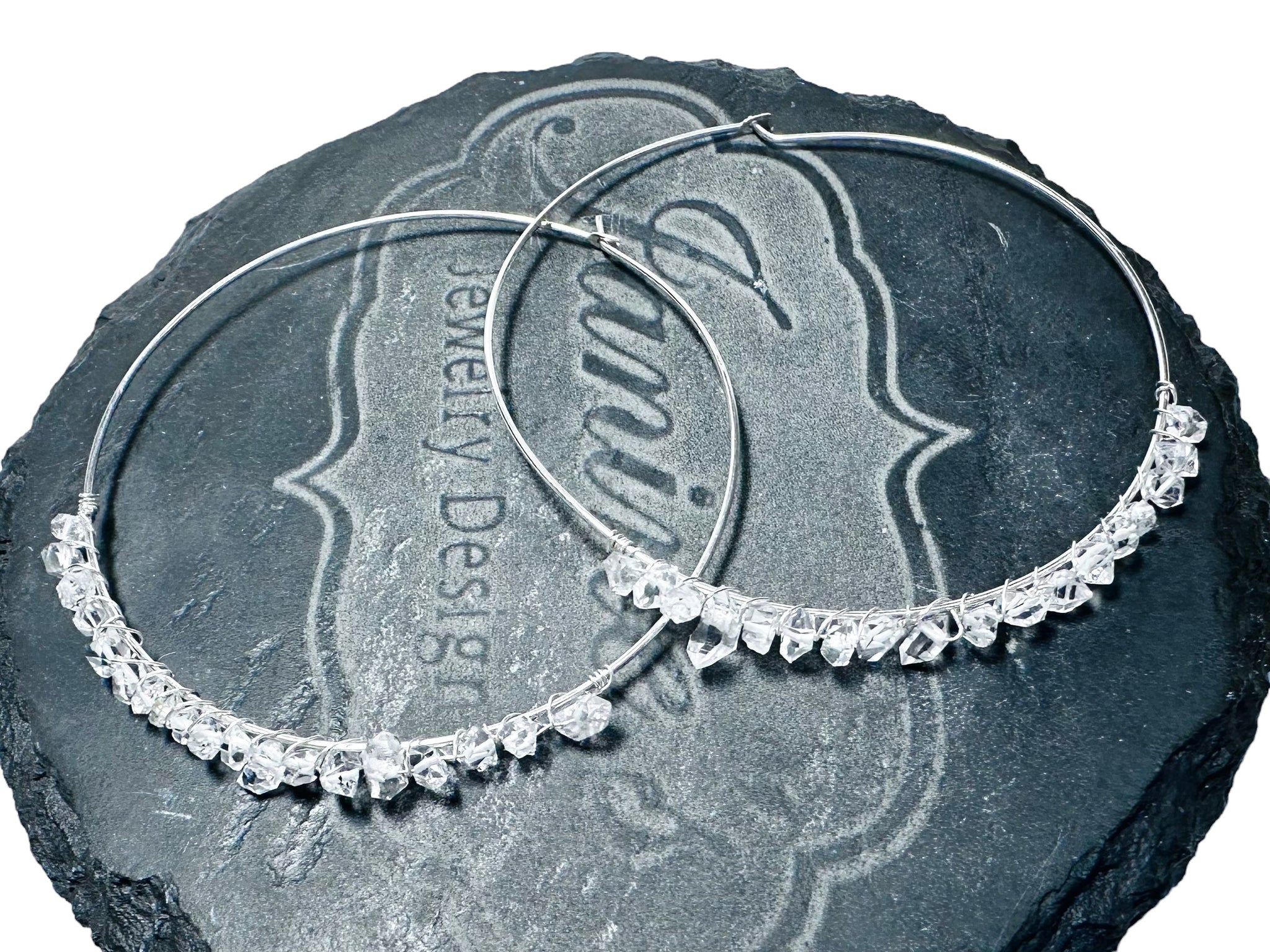 Introducing the Crystal Hoops, crafted from 2” sterling silver hoops wire wrapped with genuine Herkimer diamond beads. These earrings are not only elegant and lightweight but also enhance your accessory collection with the unique properties of Herkimer diamonds, known for their clarity and energy amplification.