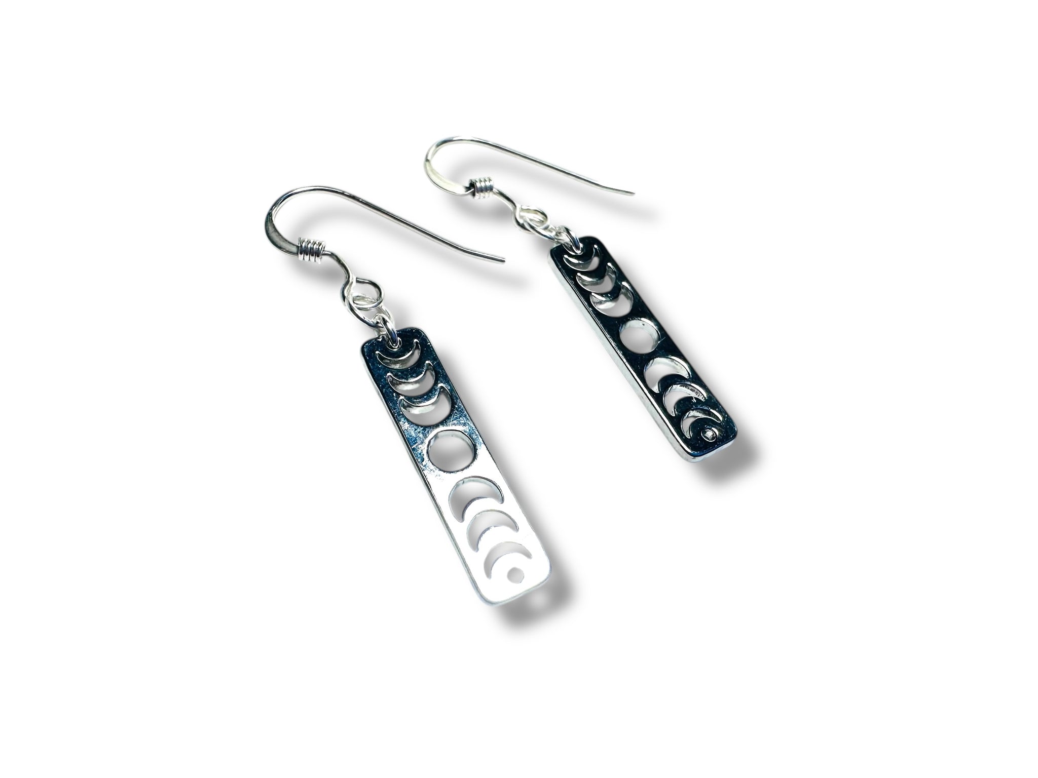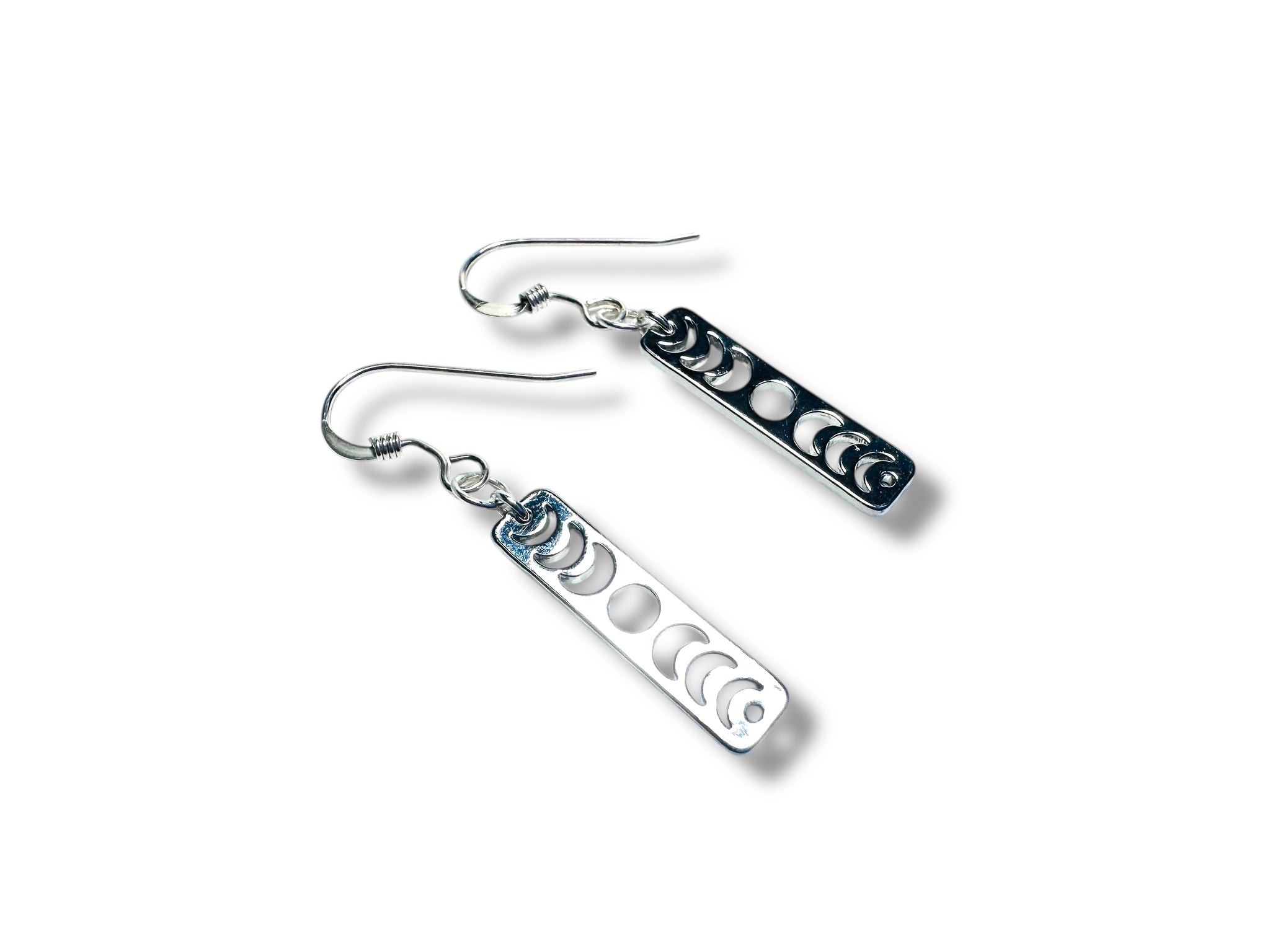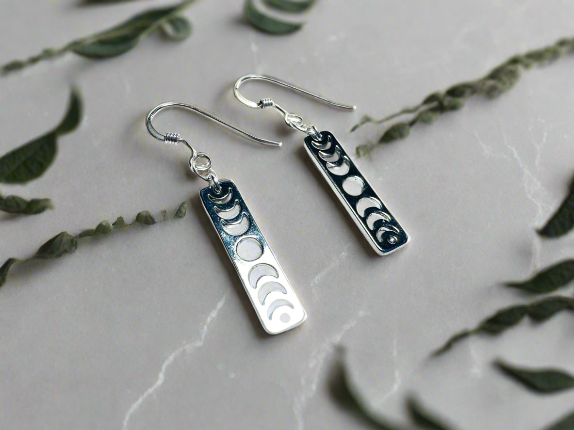 Earrings are 1.25” long. Sterling silver ear wires. Silver plated brass moon phase charms.