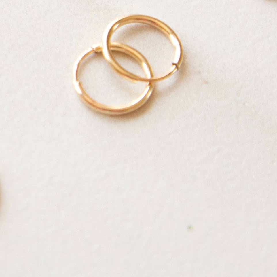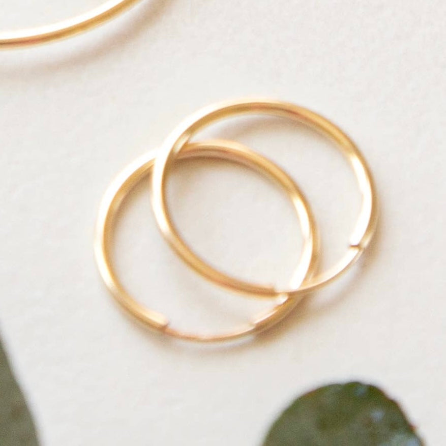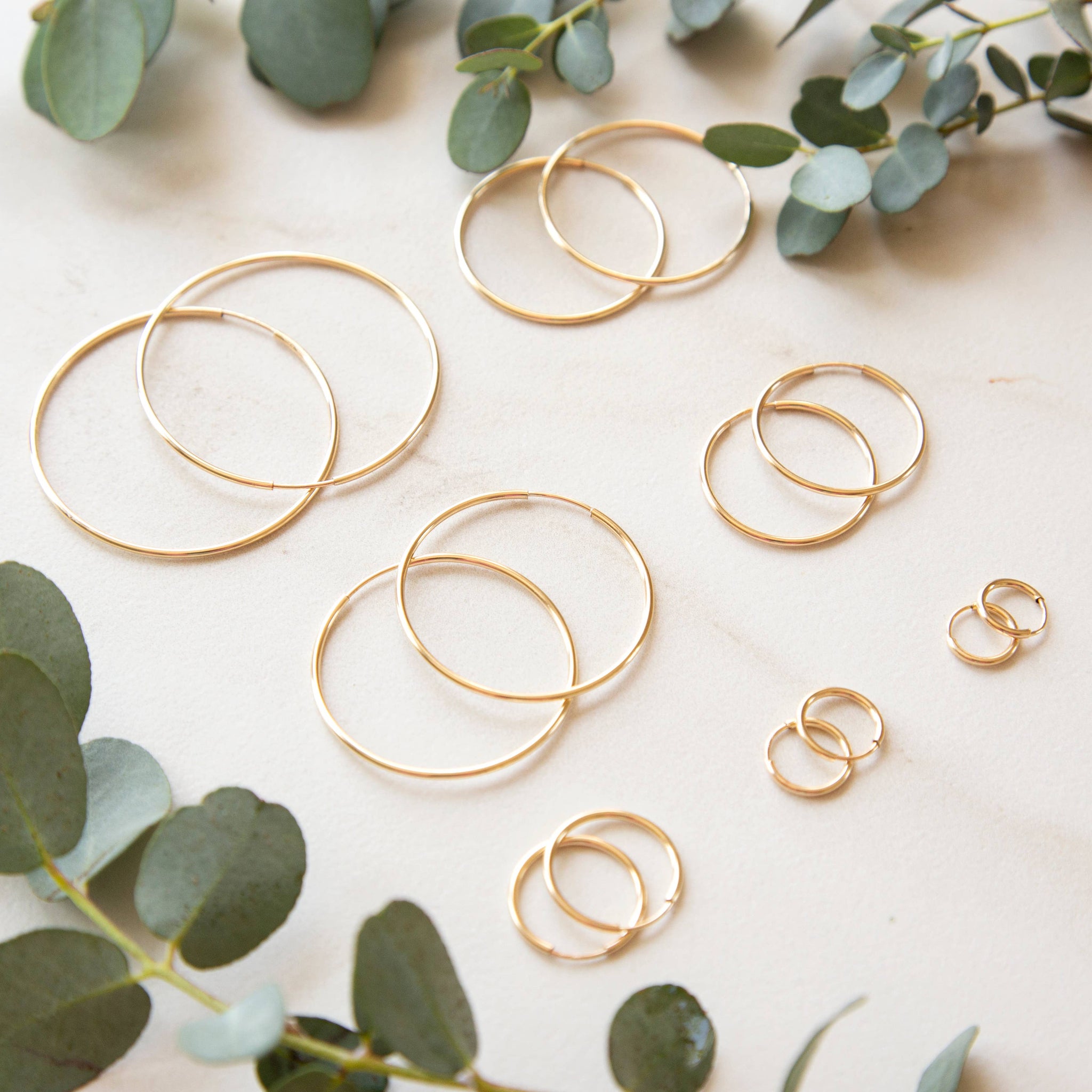 14k gold-fill hoops. The ear wire fits into the opposite end of the hoop for an endless-circle look. Available in x6 sizes! Priced per pair. made by Stowaway Jewelry