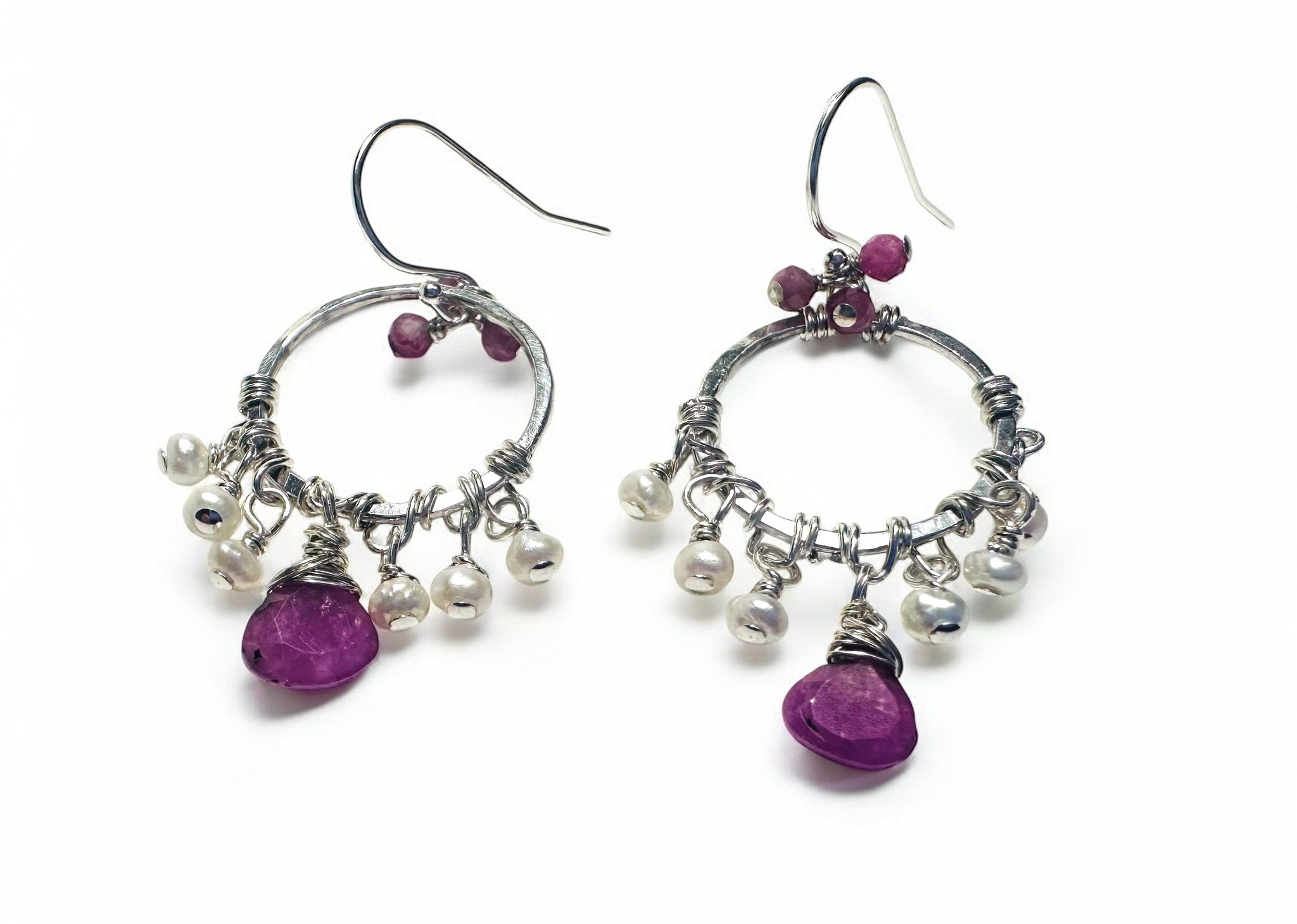 1.5” long earrings. Tiny freshwater Pearl beads wire wrapped with sterling. Pink tourmaline teardrop and tiny accent beads.