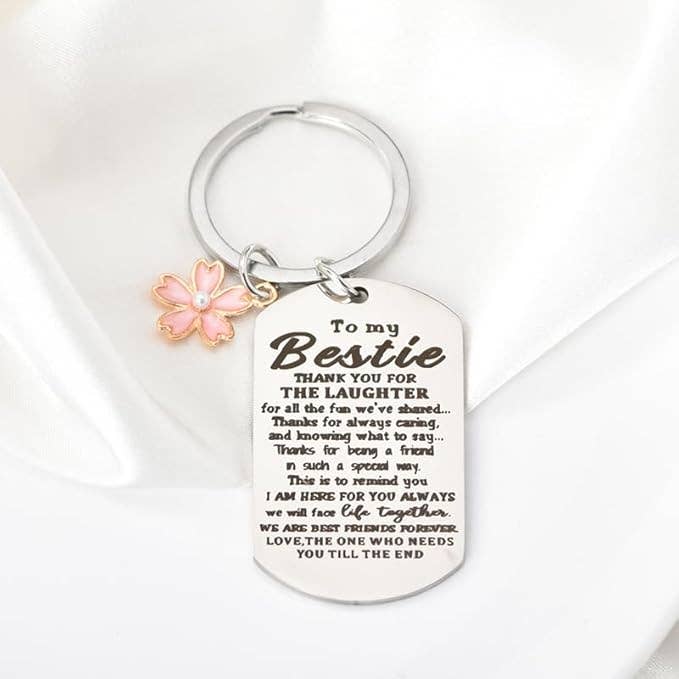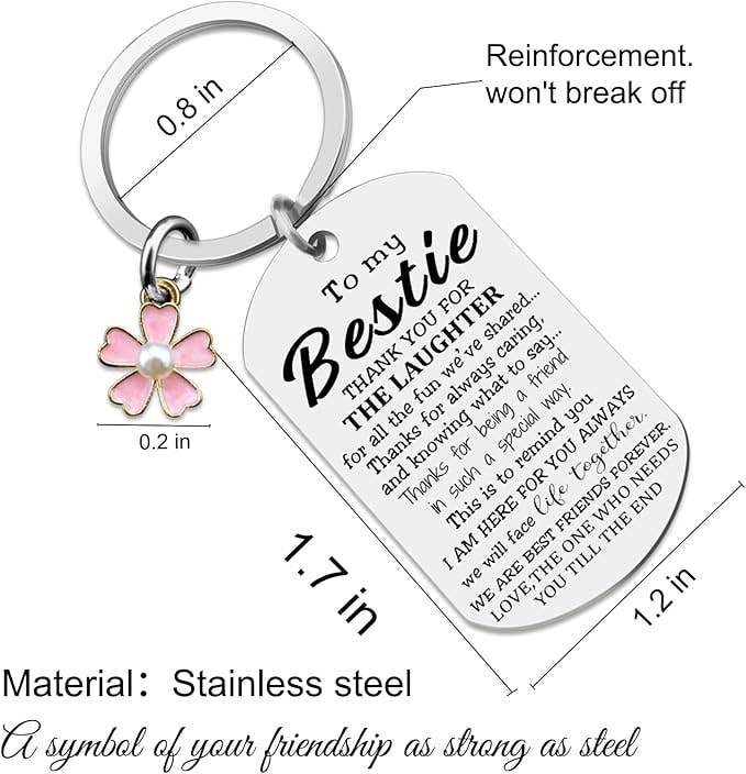 Show your best friend how much you value her support and laughter with this beautifully engraved stainless-steel keychain. Featuring a heartfelt message of gratitude and an elegant pink flower charm, it’s a meaningful keepsake for birthdays, holidays, or “just because.” The lightweight tag can even double as a small mirror on the back, symbolizing a friendship that shines through life’s ups and downs. Features Heartfelt Inscription: Engraved with a “Thank you for the laughter” best friend message Durable Stainless Steel: Hypoallergenic, tarnish-free, and built to last Lightweight Yet Sturdy: Tag measures approx. 1.7" x 1.2", with a 0.8" keyring Charming Flower Accent: Adds a sweet, feminine touch (0.2" pink enamel charm)