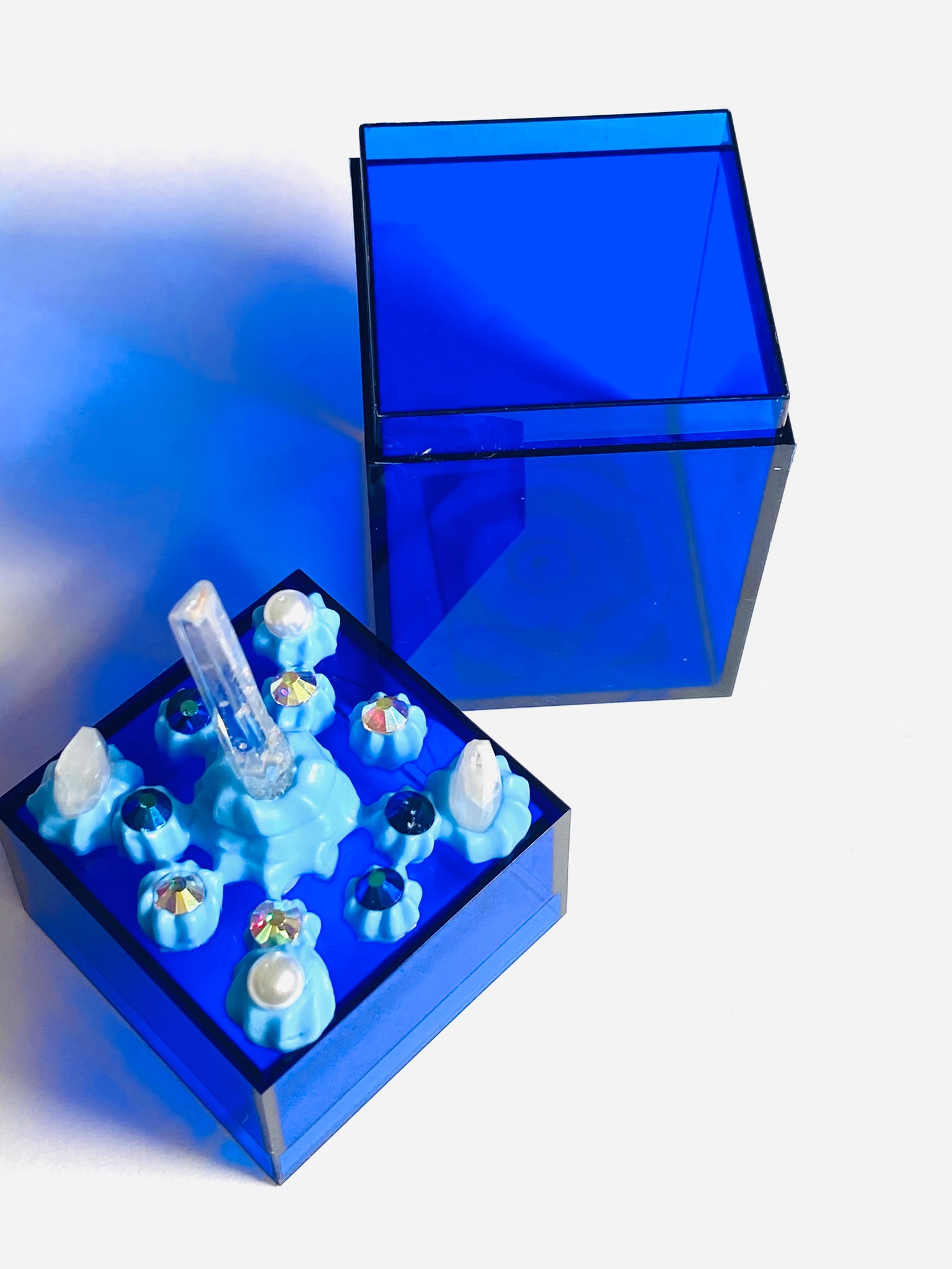 Elevate your jewelry storage with this enchanting lucite box, a miniature work of art. Measuring 3"x1.5"x1.5", it features hand-applied glass and plastic gemstones, a delicate brass-stamped butterfly, and decorative faux pearls accented with quartz crystal and moonstone details. The whimsical "icing" glue embellishments add a charming, one-of-a-kind character. Perfect for organizing rings, earrings, and keepsakes while adding a touch of elegance to any vanity or shelf.