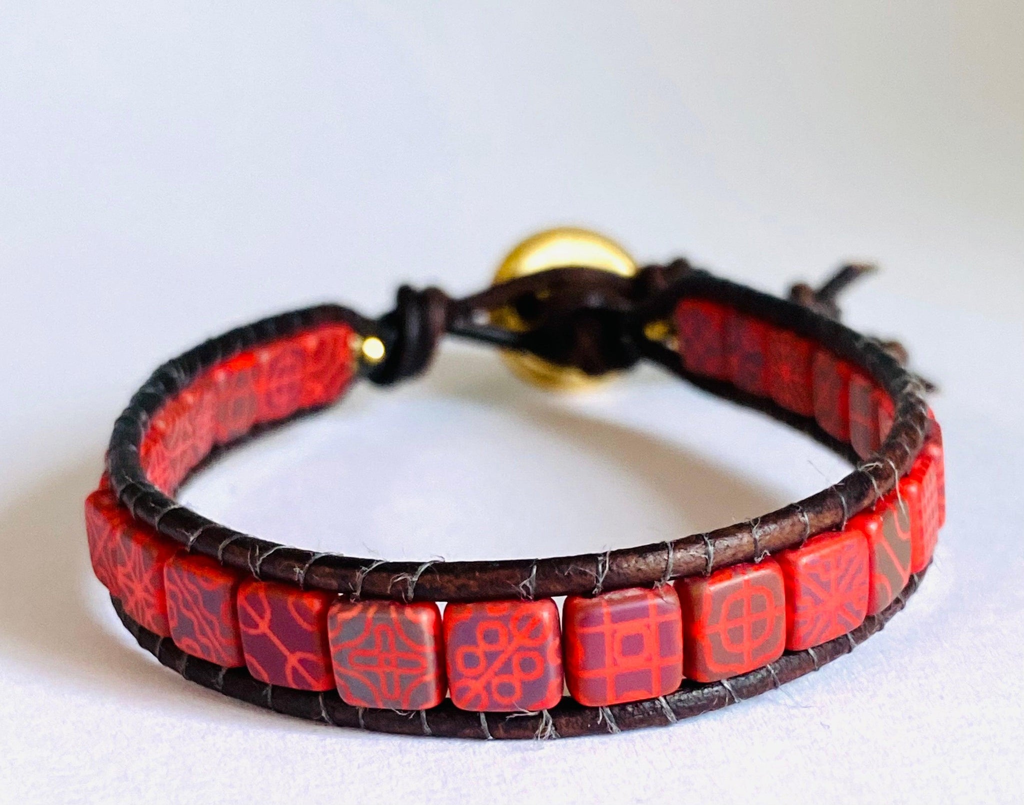 Handwoven leather bracelet featuring a custom screen-printed glass tile paired with vintage button accents. Each cuff combines artisanal craftsmanship with unique design—perfect for stacking or wearing solo. Available in multiple colors with size options to ensure the perfect fit. A wearable work of art that adds character to any outfit.