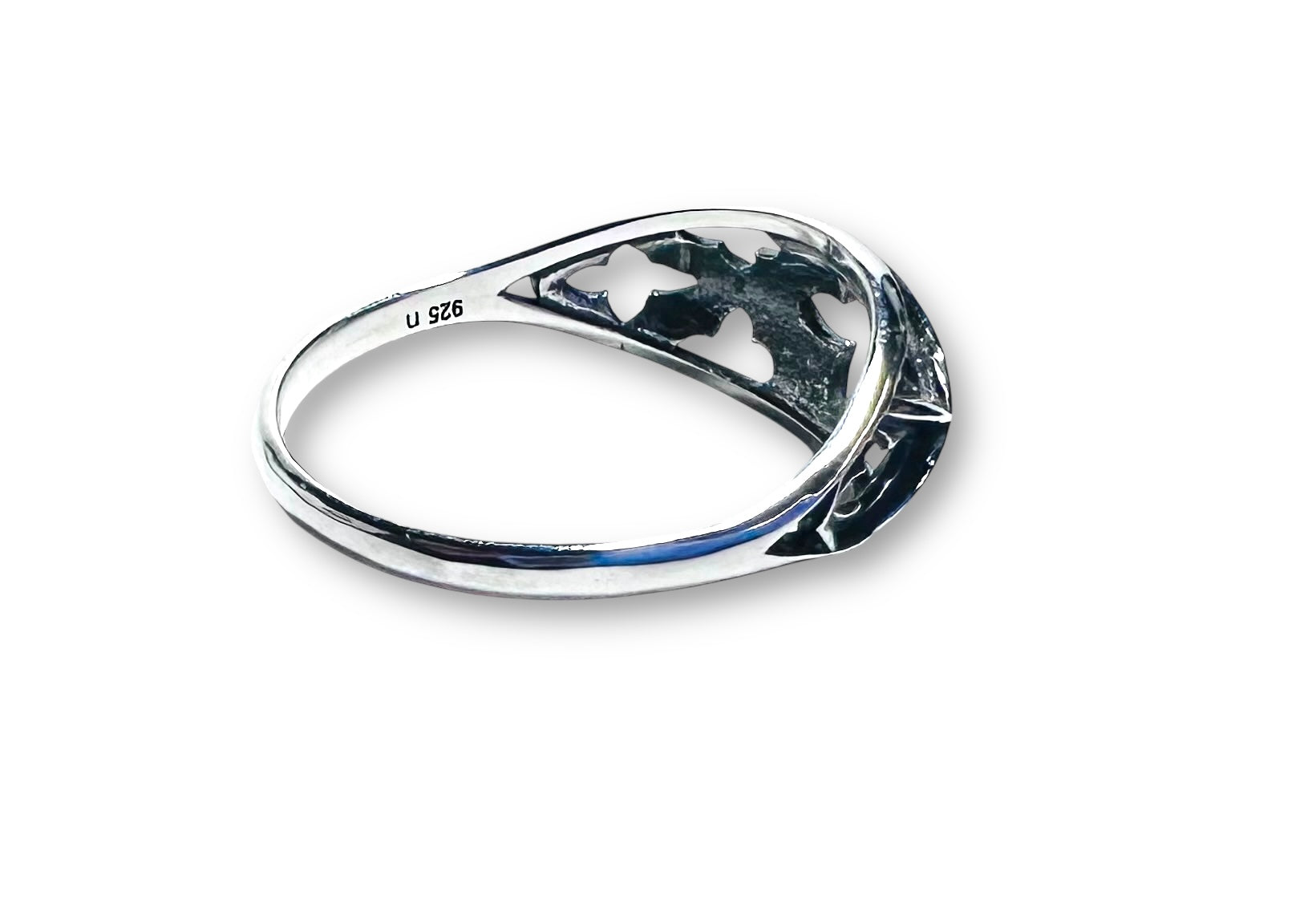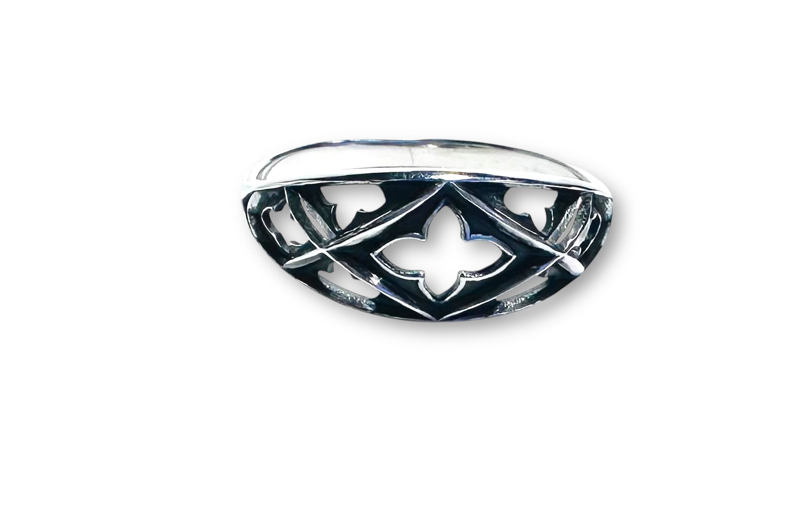 Antiqued silver ring with stained glass patterns in a filigree style. Size 8.5.