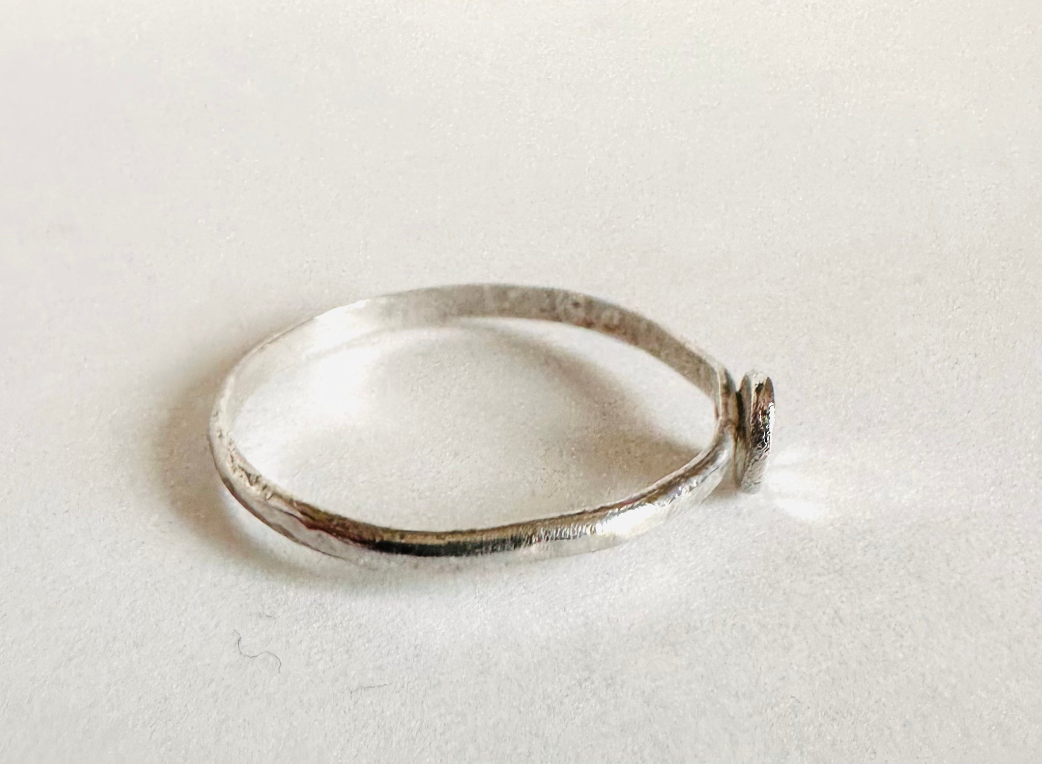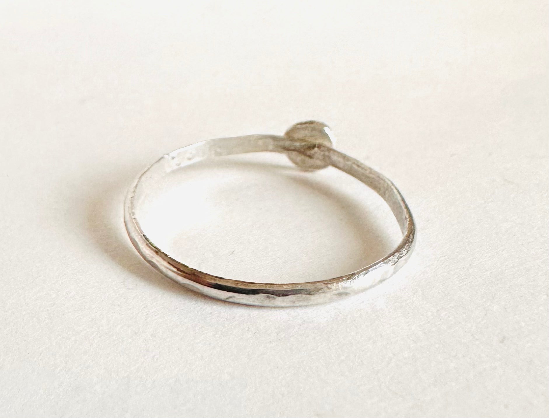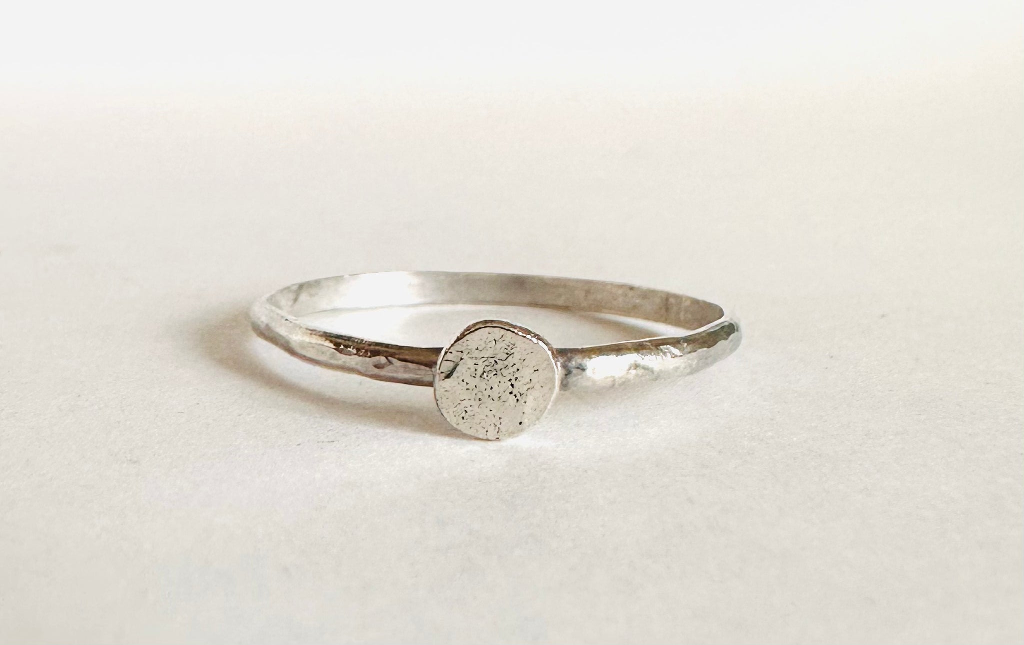 Elevate your everyday style with this delicate Size 9 stacking ring, featuring a striking 4mm silver hammered circle soldered onto a slim 1.5mm hammered band. The textured finish catches light beautifully, adding dimension and visual interest to your hand. Perfect worn alone for understated elegance or layered with other rings to create a personalized, modern look. Handcrafted quality meets versatile design in this essential piece.