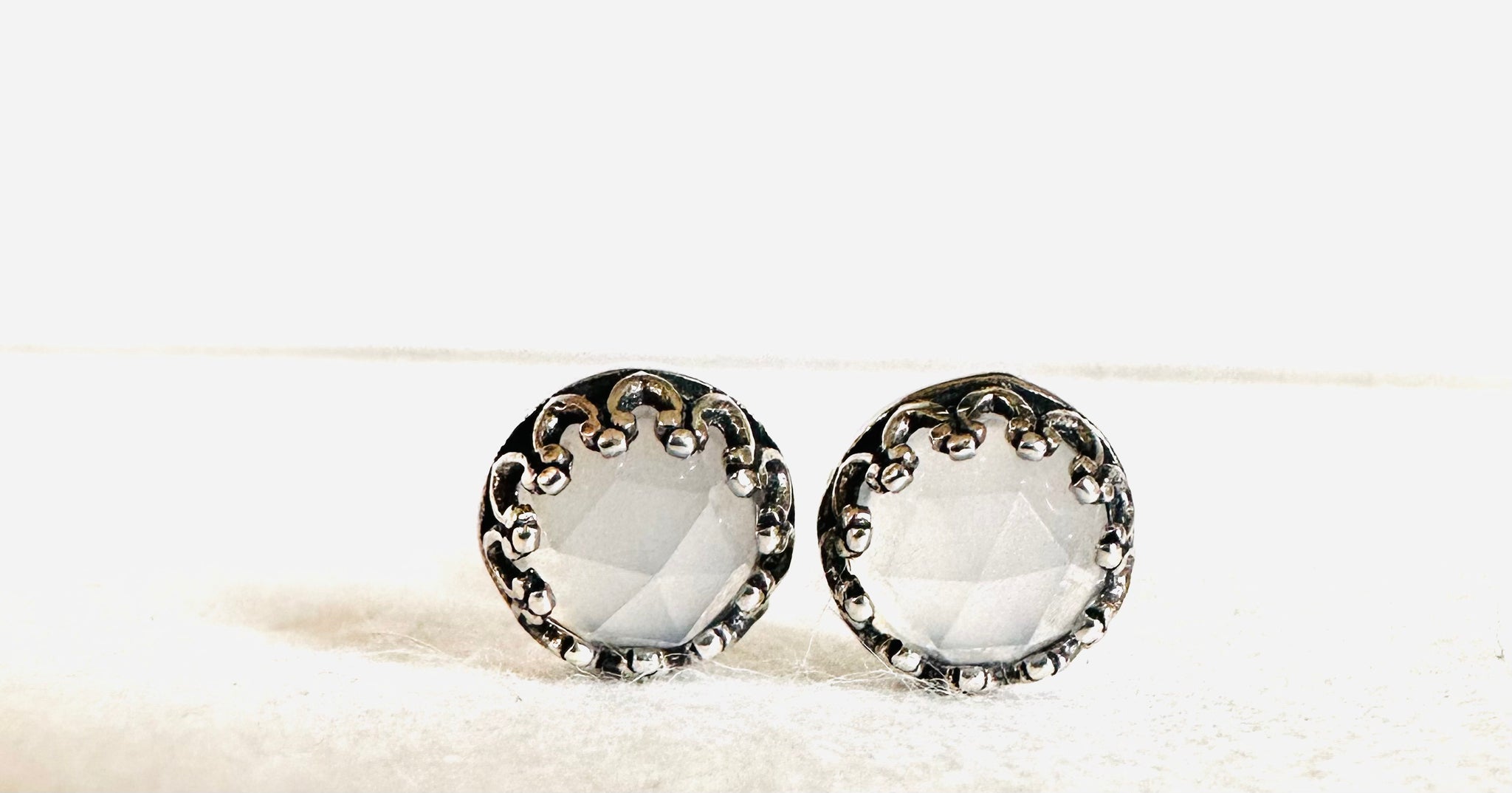 Light blue chalcedony gemstones set in delicate filigree crown settings create an understated elegance that works for any occasion. Each 6mm stone catches the light beautifully, offering a soft, luminous glow that complements both casual and formal looks. These stud earrings balance simplicity with sophistication—the perfect everyday piece that feels special without demanding attention.