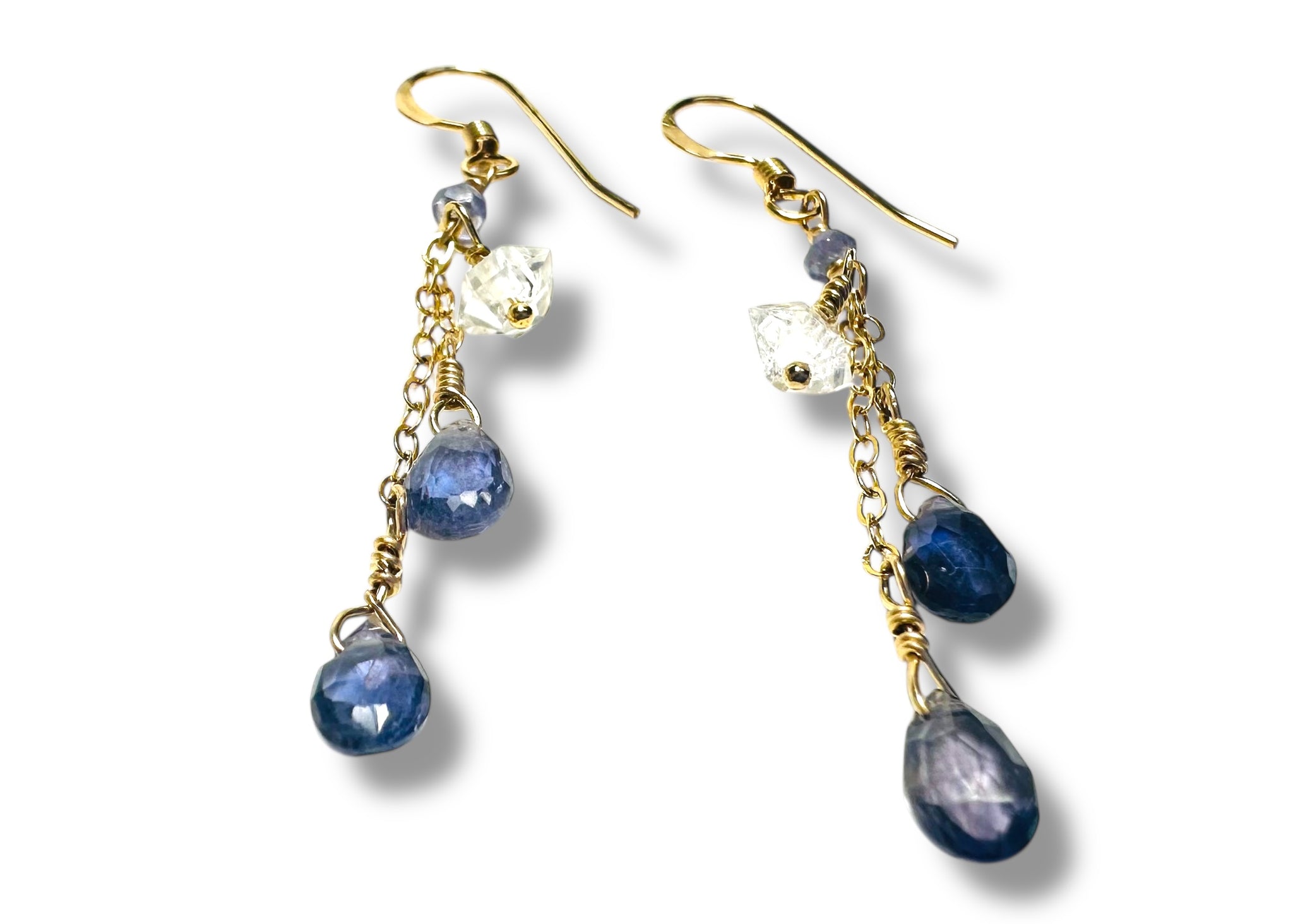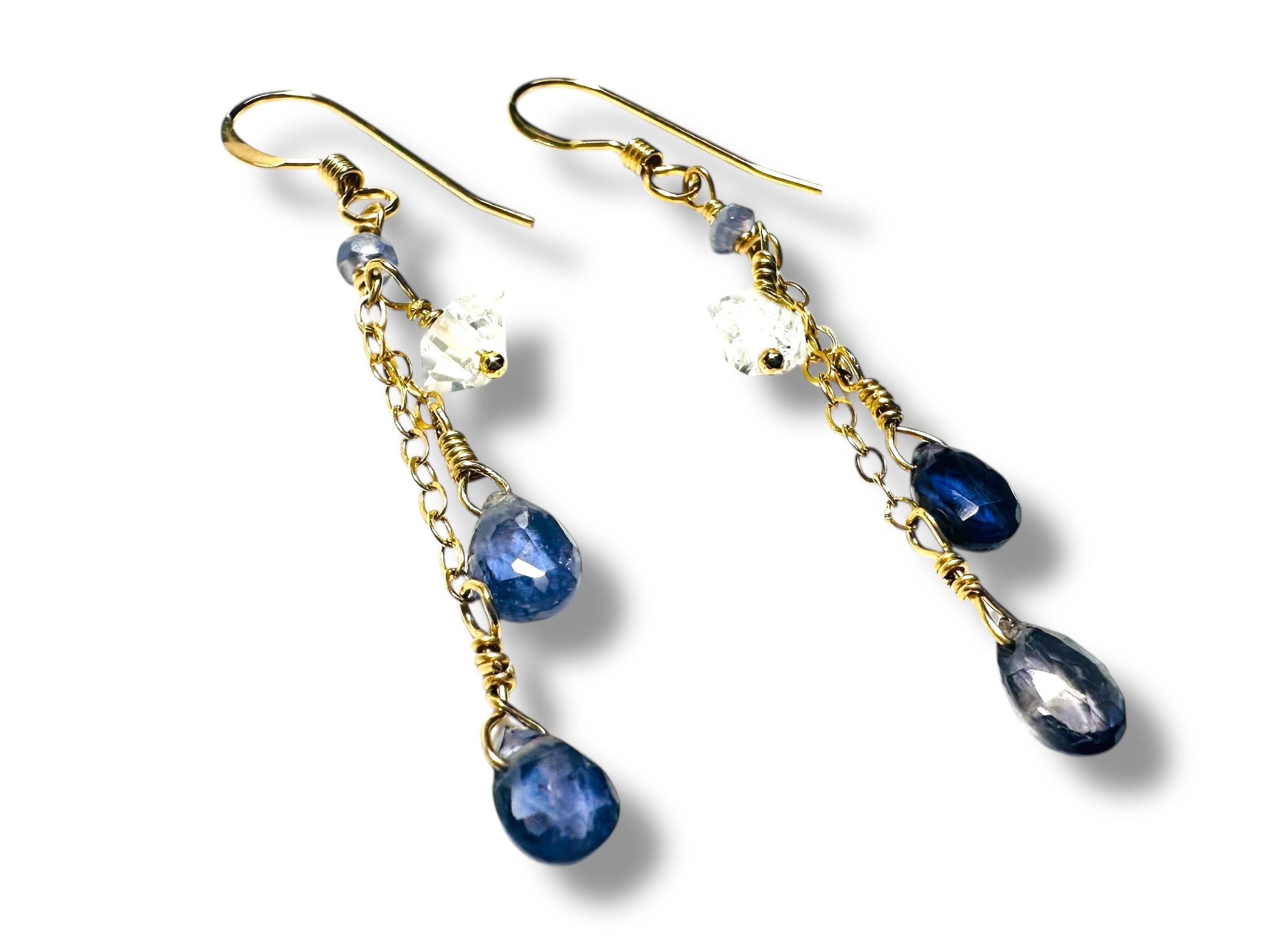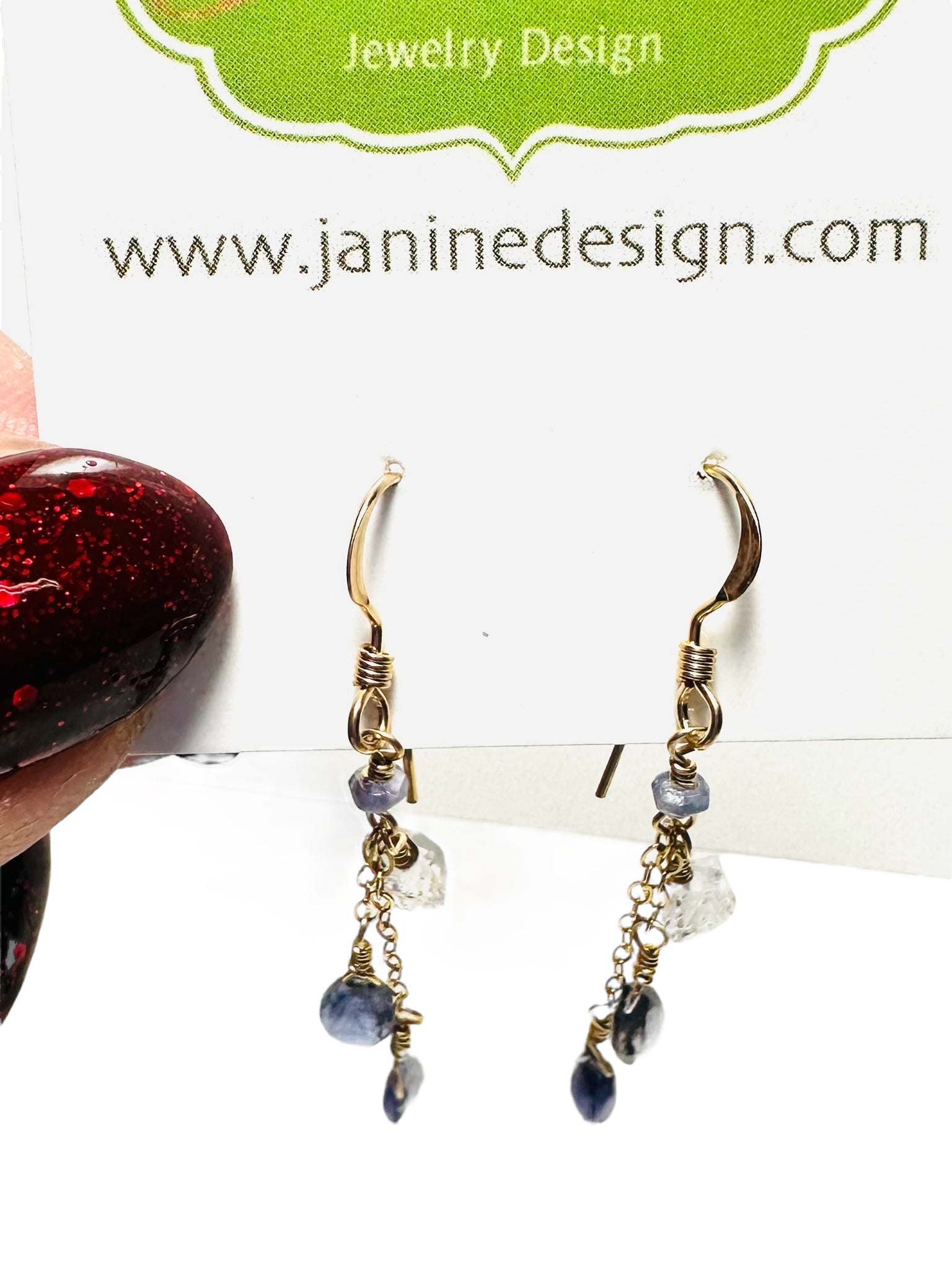 Gold filled chain with Herkimer Diamond and Iolite beads delicately intertwined, creating a stunning dainty look. The beads are carefully wire-wrapped with high-quality gold filled over sterling wire, connected to a chain. The earrings are finished with Gold Filled ear wires for a secure and elegant fit.