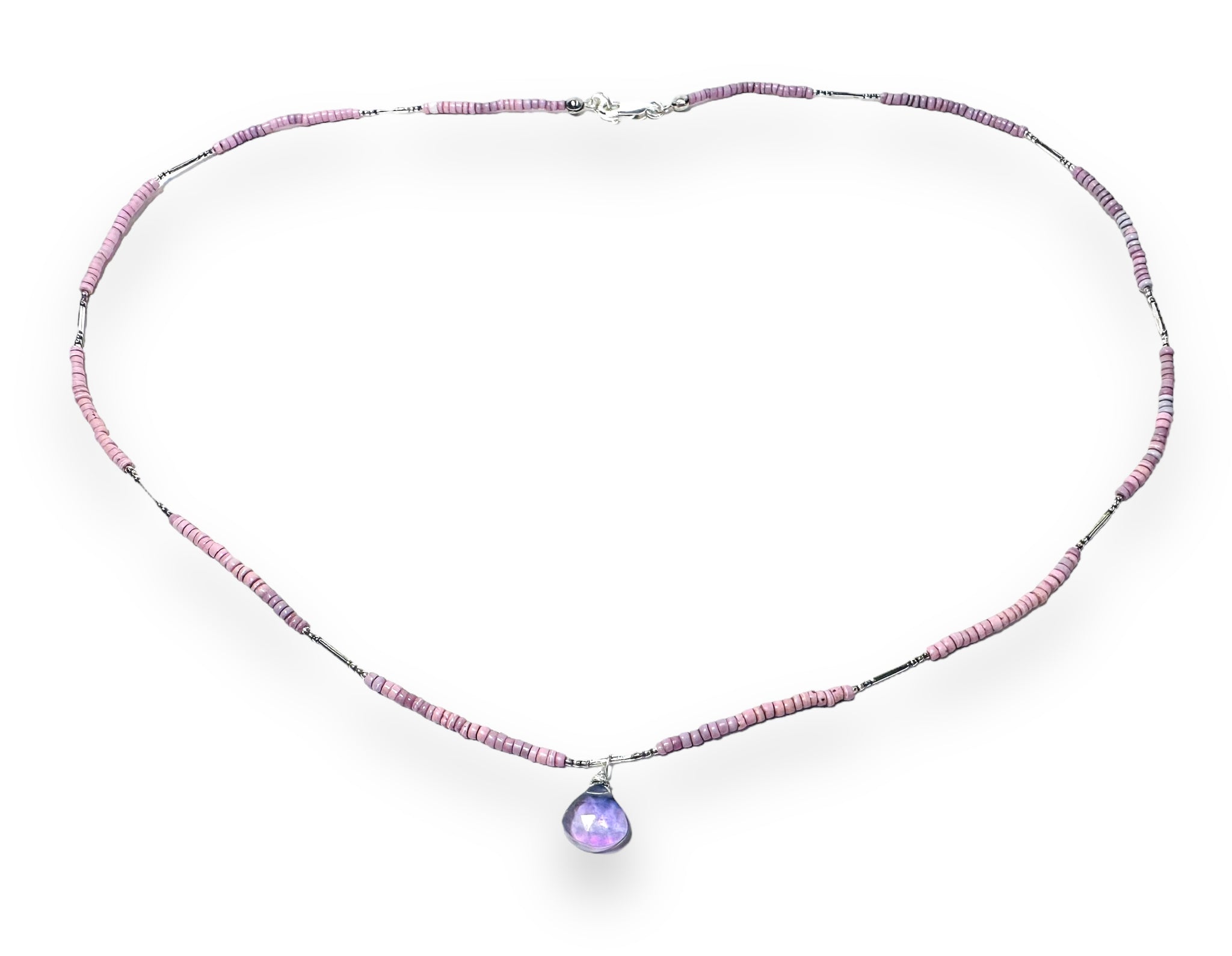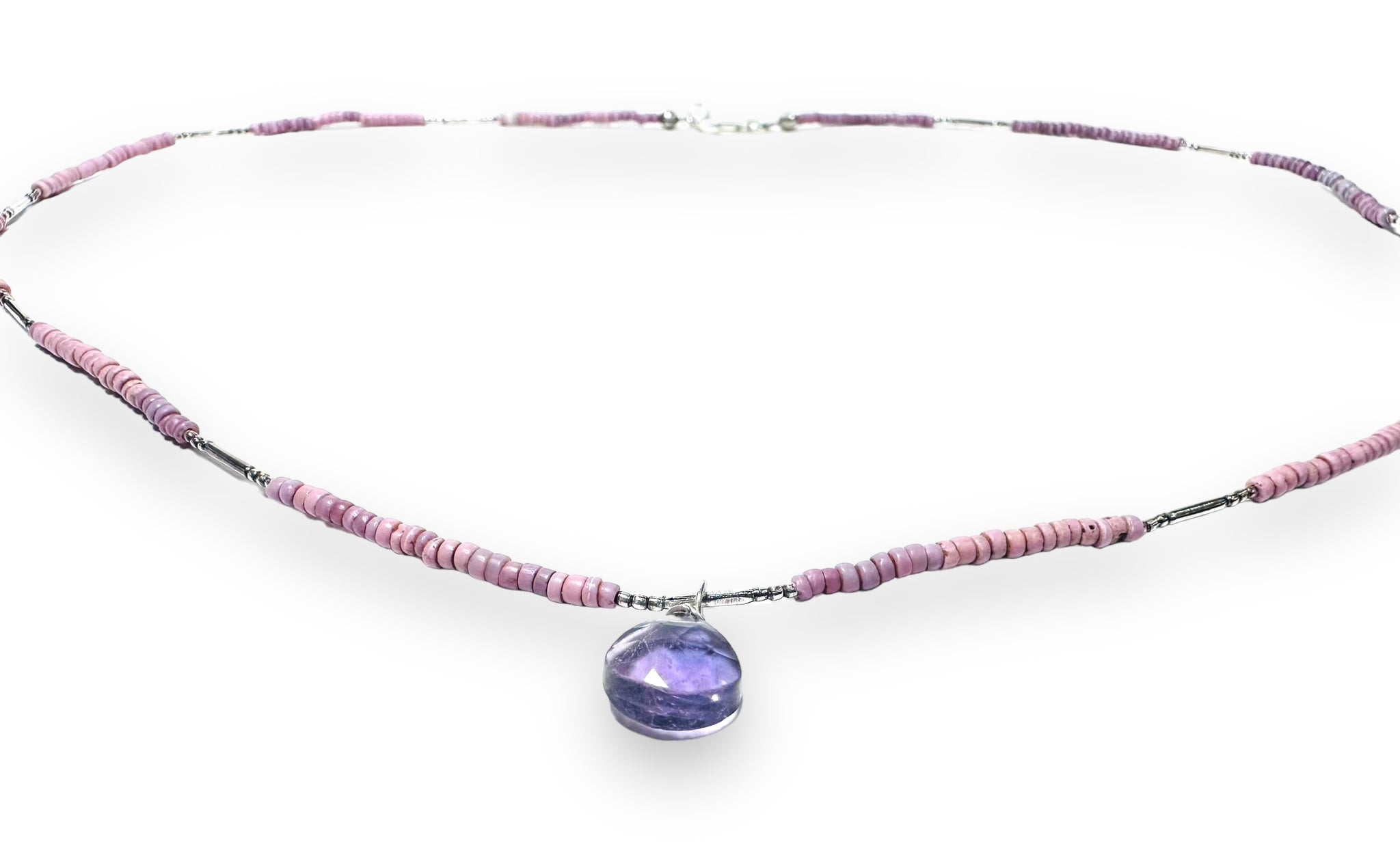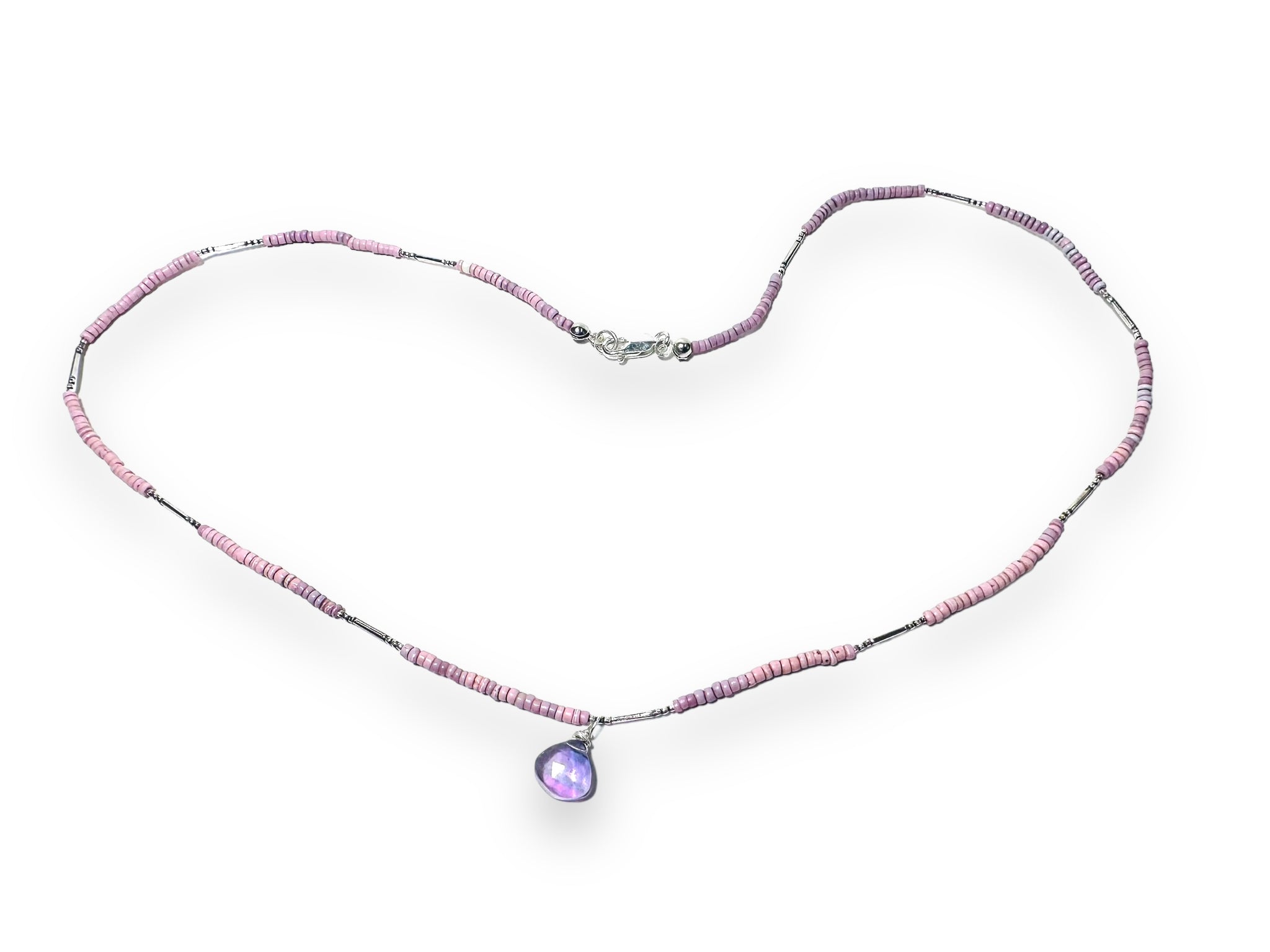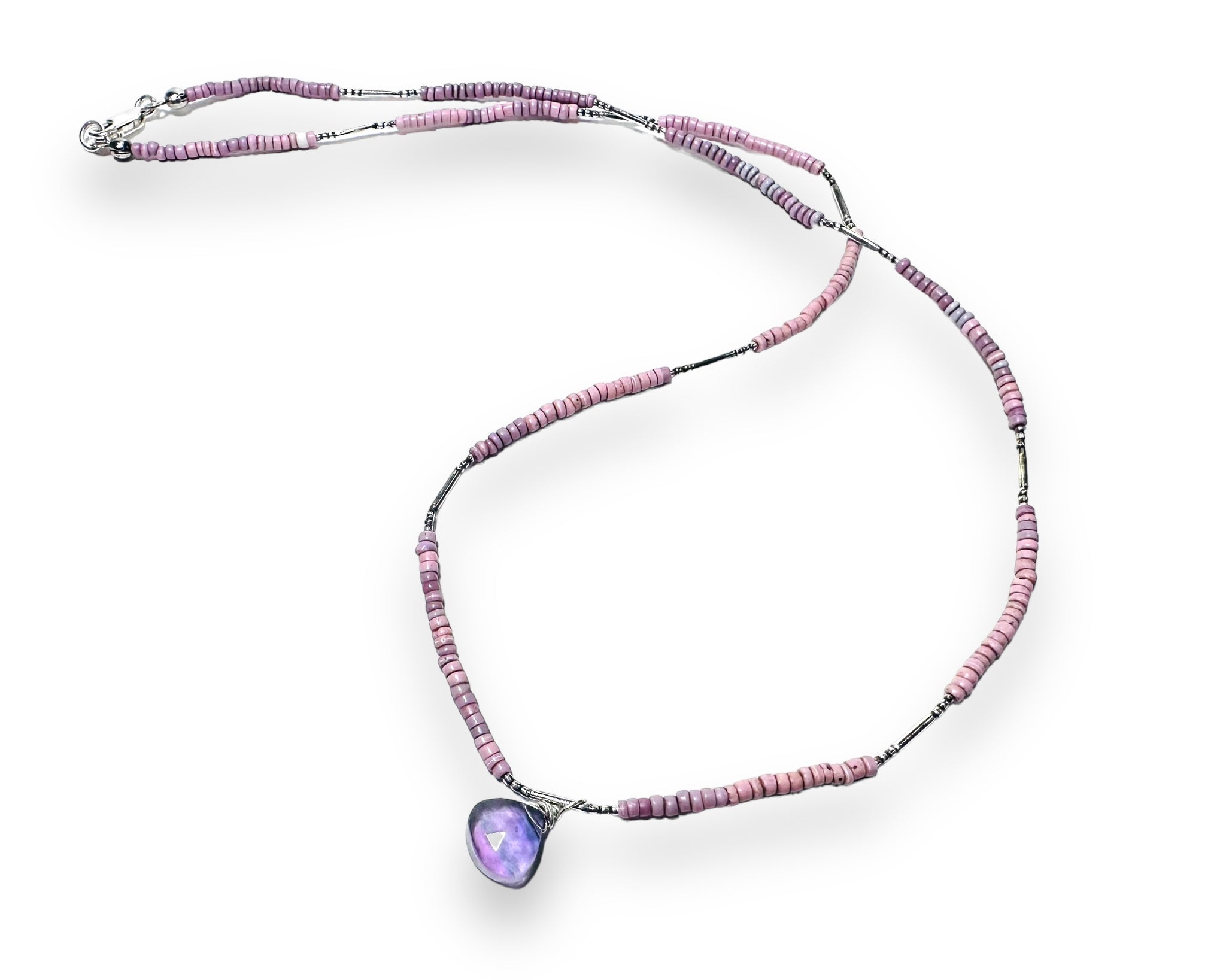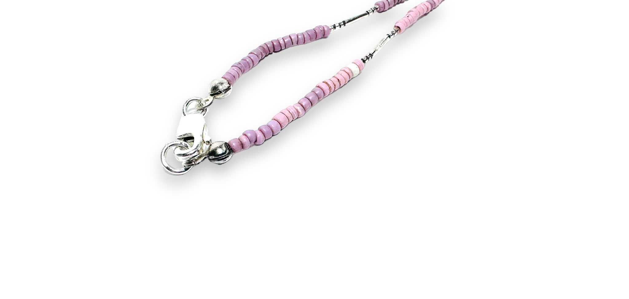 African seed beads in a subtle lilac color mix. Strung with silver filled hill tribe tiny beads between the matte brass beads. Wire wrapped fluorite teardrop beads.