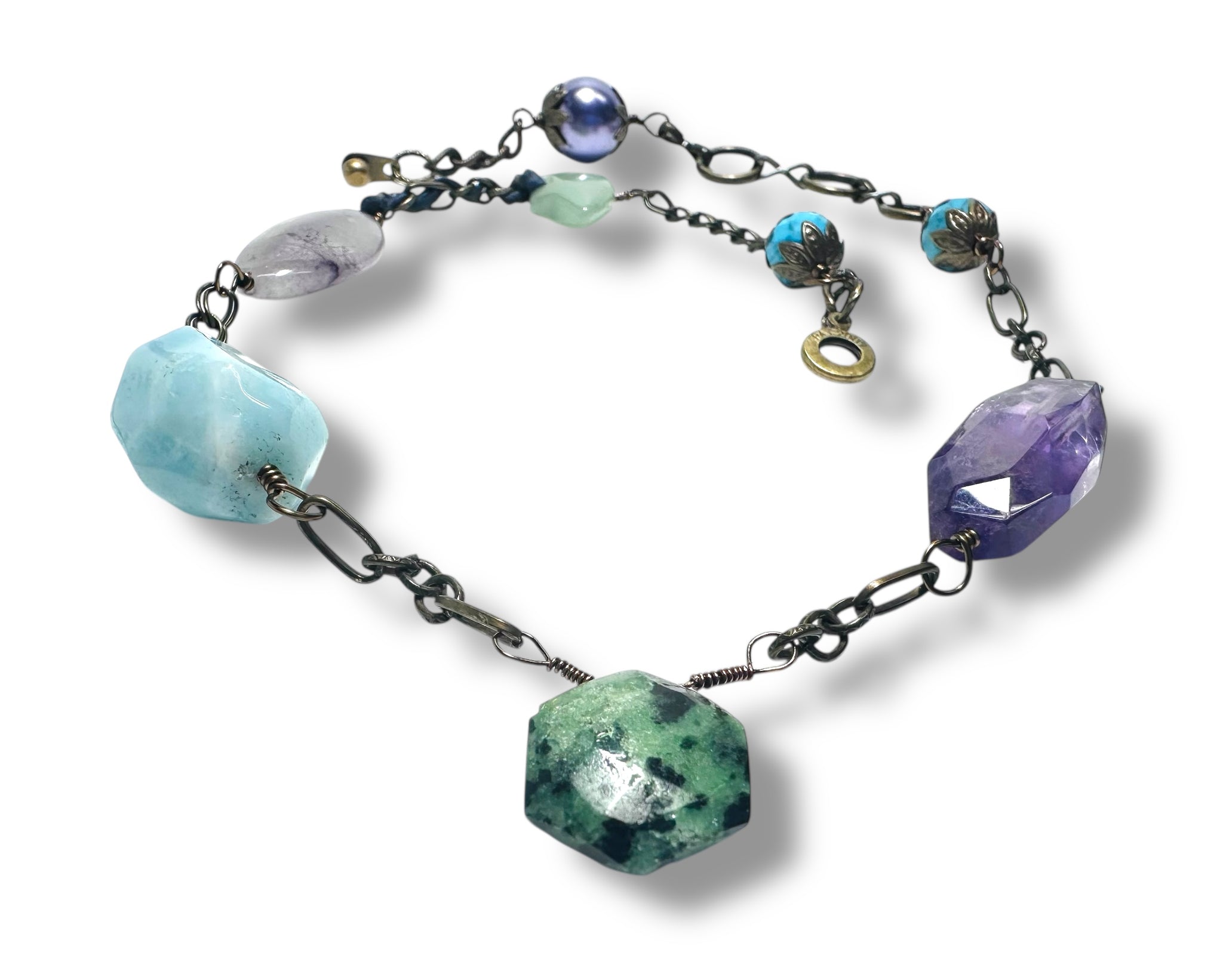 turquoise, jade, quartz, Larimar, Ruby Zoisite, Amethyst and glass.