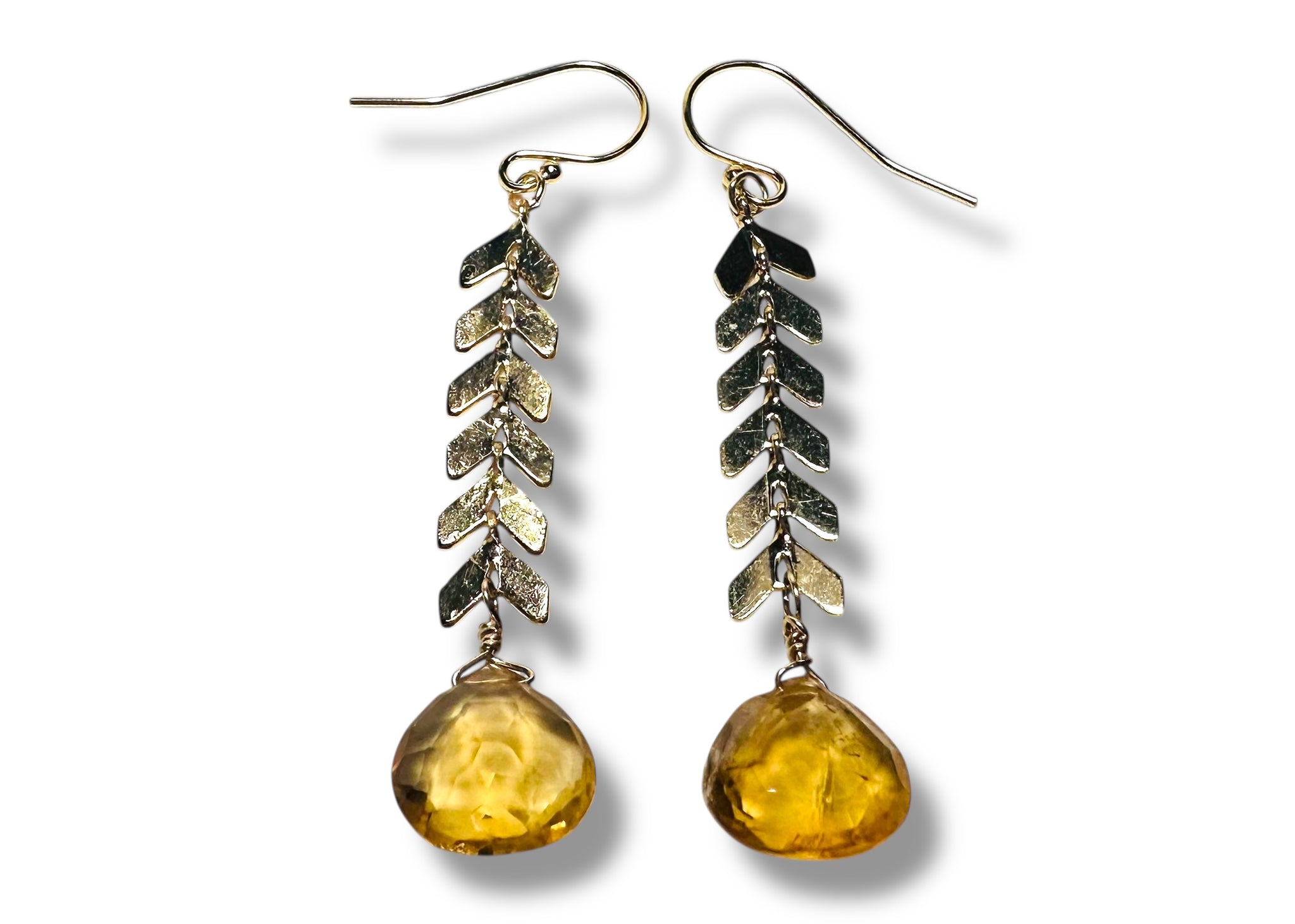 These stunning Citrine Chevron Earrings are handcrafted with genuine Citrine hand cut drops and hand wired with gold filled wire for added strength and durability. The gold filled ear wires are not only stronger than plated gold, but also less irritating to sensitive ears. Finished with a brass chevron chain, these earrings are a perfect blend of style and quality. Make a statement with these unique gemstone earrings.