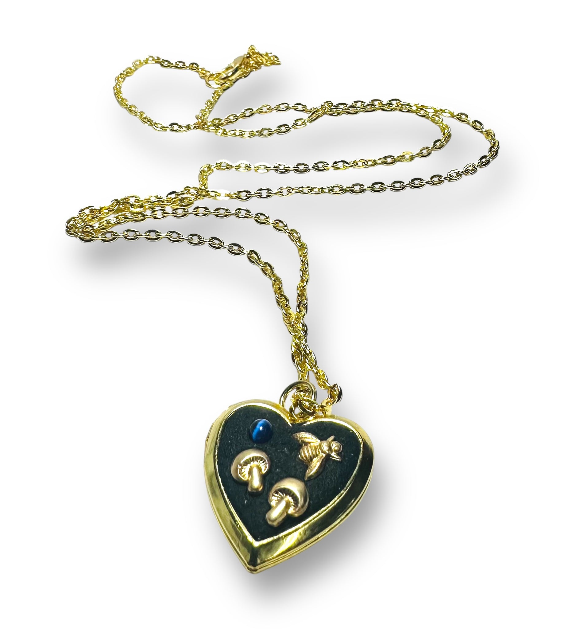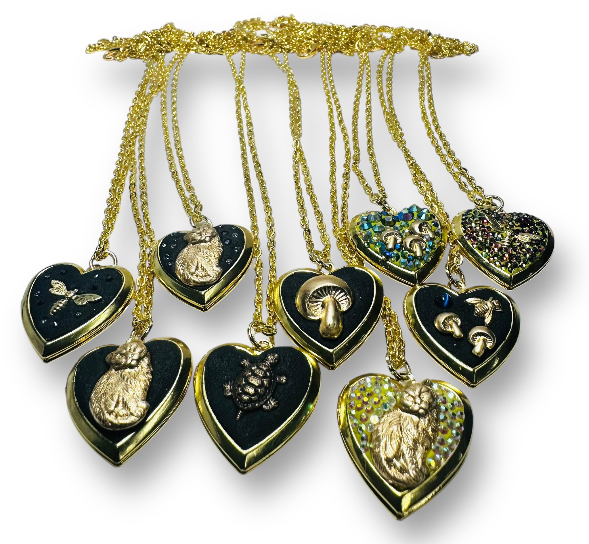 Brass lockets around 1”. Adorned on top with epoxy clay and brass decorative stampings and genuine high-grade crystals.