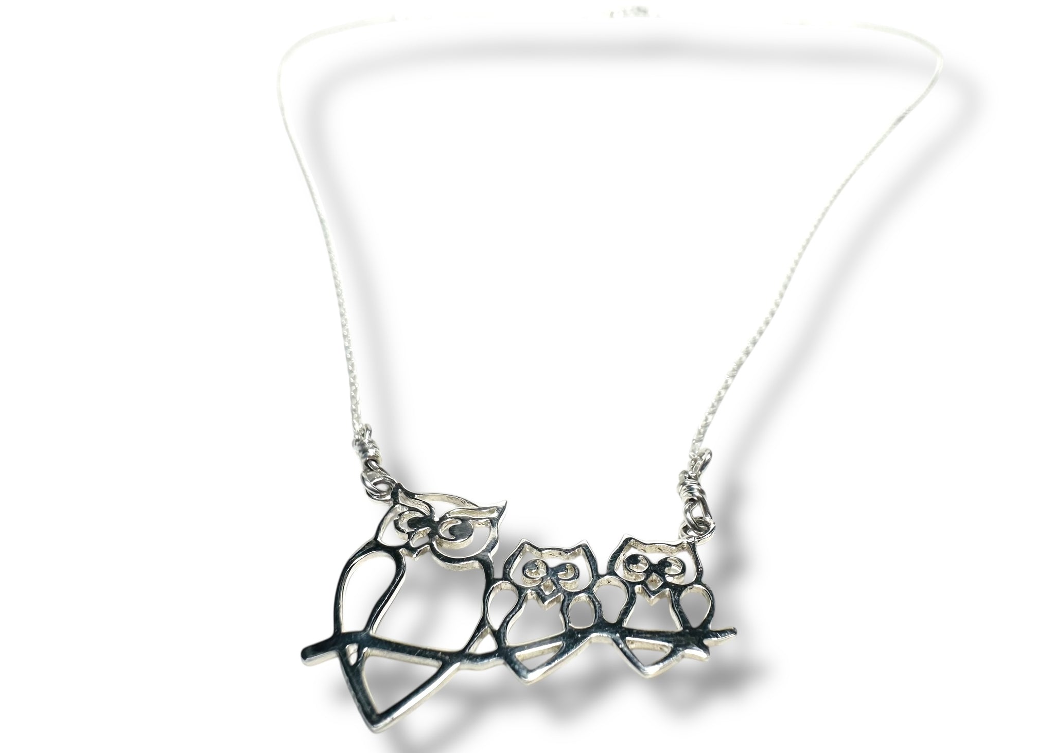 Fly high with style with our Mama Owl and Her 2 Babies Necklace! This charming 19" sterling silver pendant and chain are wire wrapped for added security and feature a spring ring clasp. The pendant depicts a mama owl with her two owlets, making it the perfect accessory for any nature lover. Wise choice!