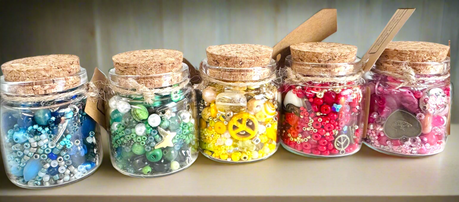 Random assortment of beads, gemstones, glass, wood, bone, and charms in a little 2” glass jar with cork cap.
