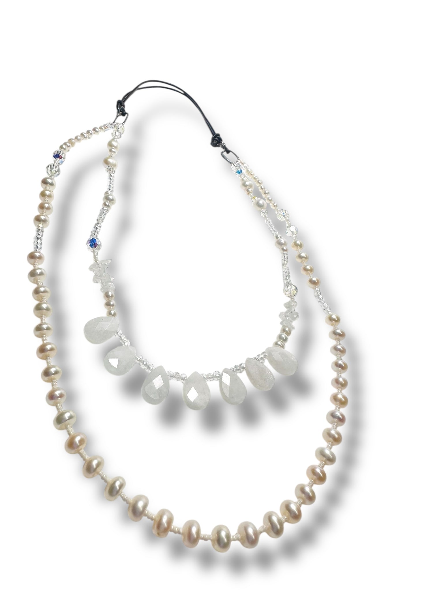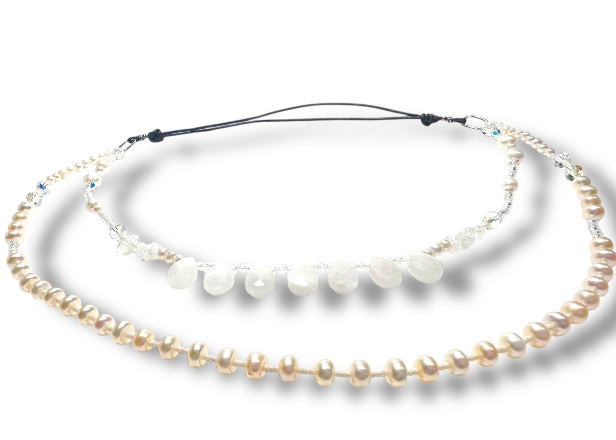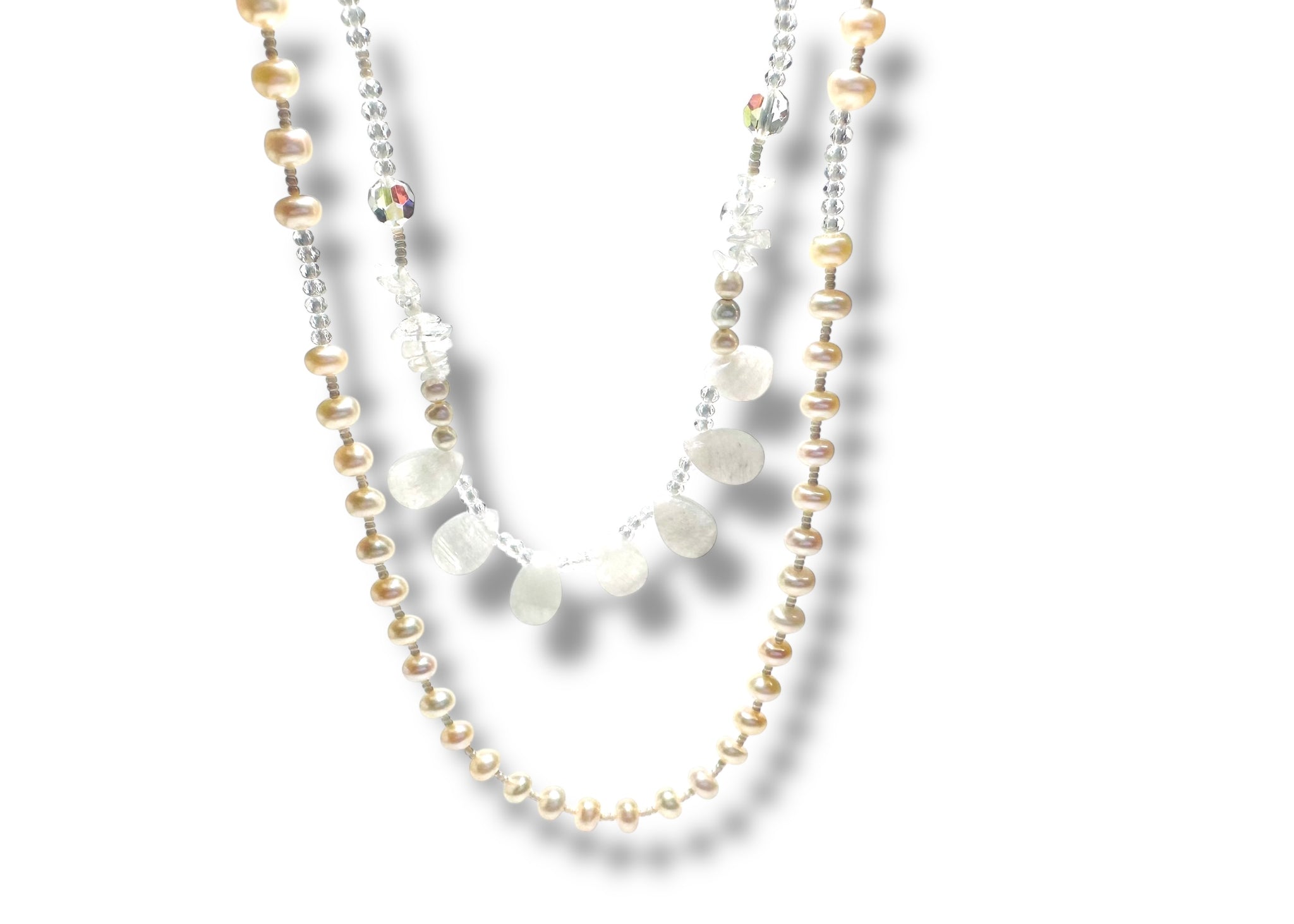 Strung with an assortment of shaped freshwater pearls, vintage crystals and moonstone beads sterling silver and crystals dispersed throughout.