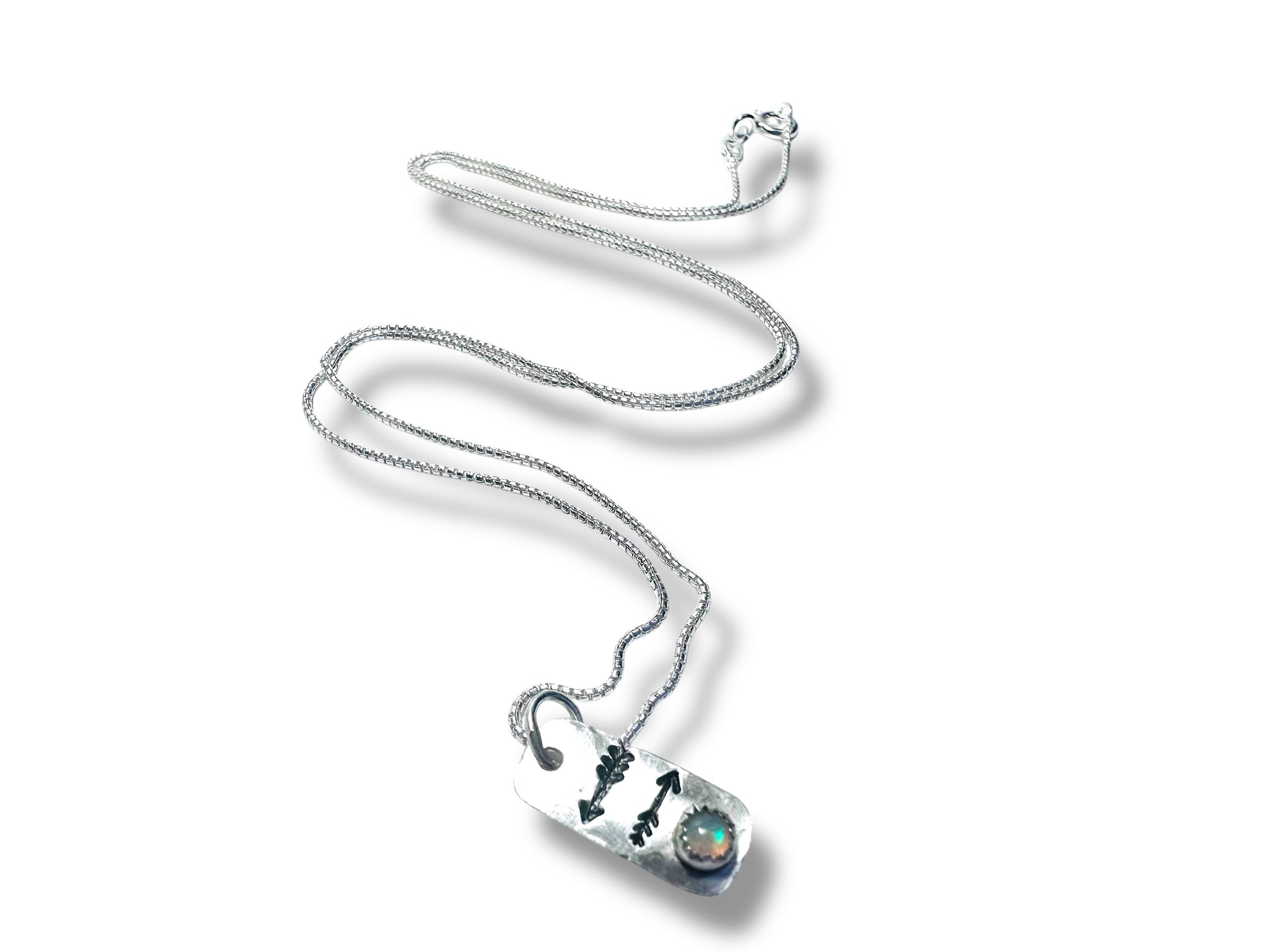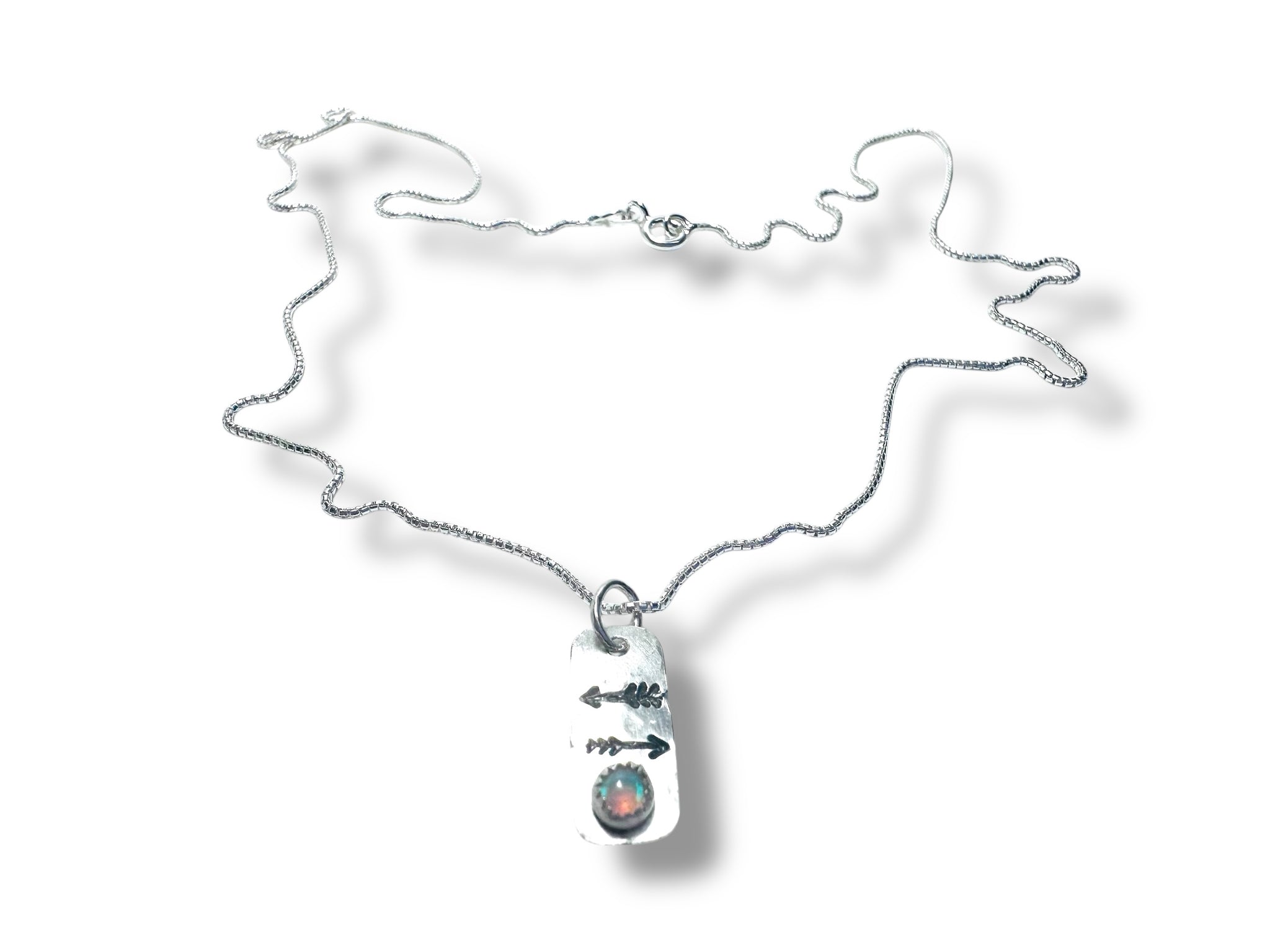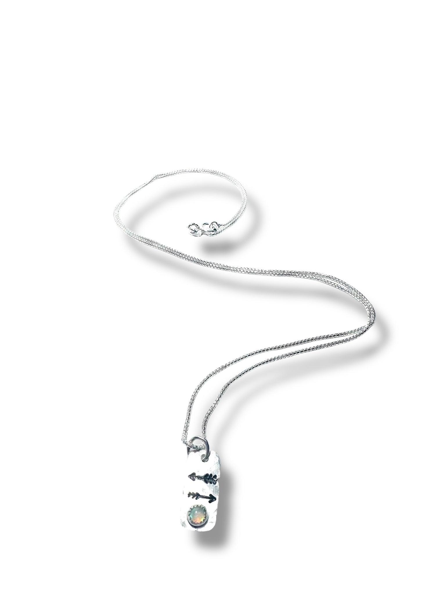 Genuine 4mm opal set and arrow shape hand stamped 1/2”x 1/4” sterling silver tag charm.