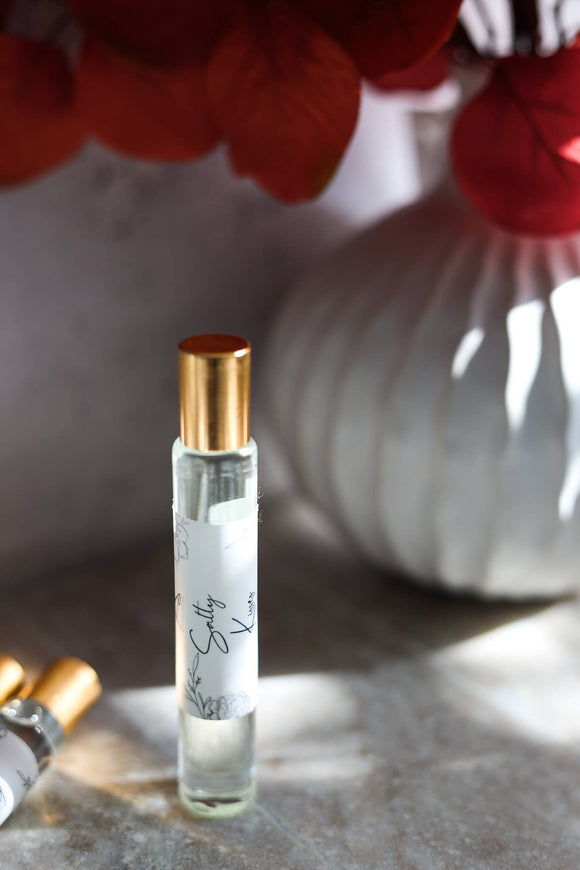 Salty Kisses a fragrance that evokes the memory of a summer day with rays of light, the heat of the sun and the taste of salt and sunscreen This 10 ml perfume roller is filled with organic jojoba oil and a beautiful luxury scent, roll it on your neck, wrists, behind your ears, enjoy this scent for hours. Carry it in your purse to reapply as needed.