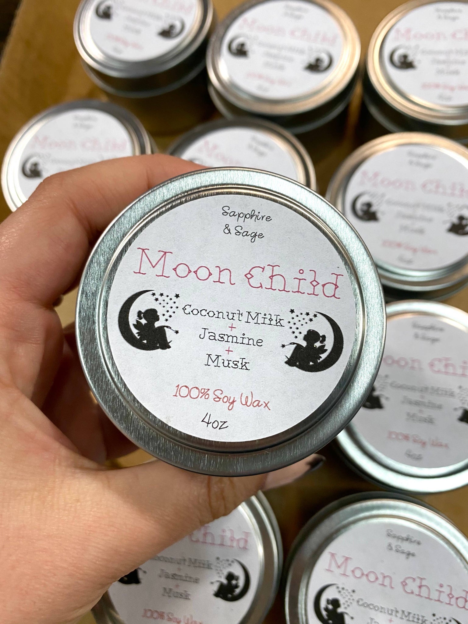 Size: 4oz tin Topped with black obsidian crystal chips & rose petals Scent Description: A sweet mix of coconut milk, bergamot, black pepper, cinnamon leaf, jasmine, tonka bean, cypress and musk. Scent Type: Spicy/musk Made of 100% Soy wax