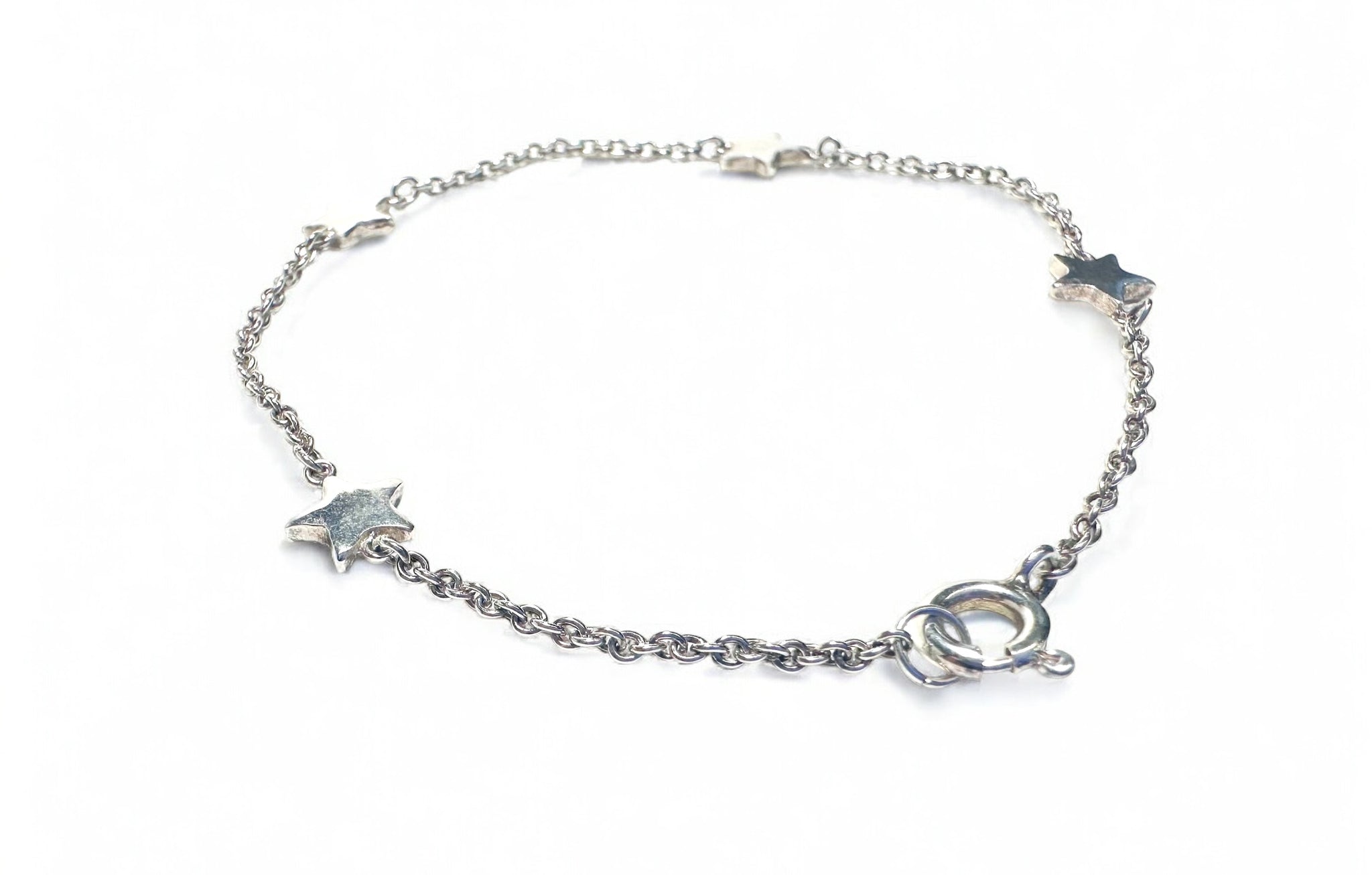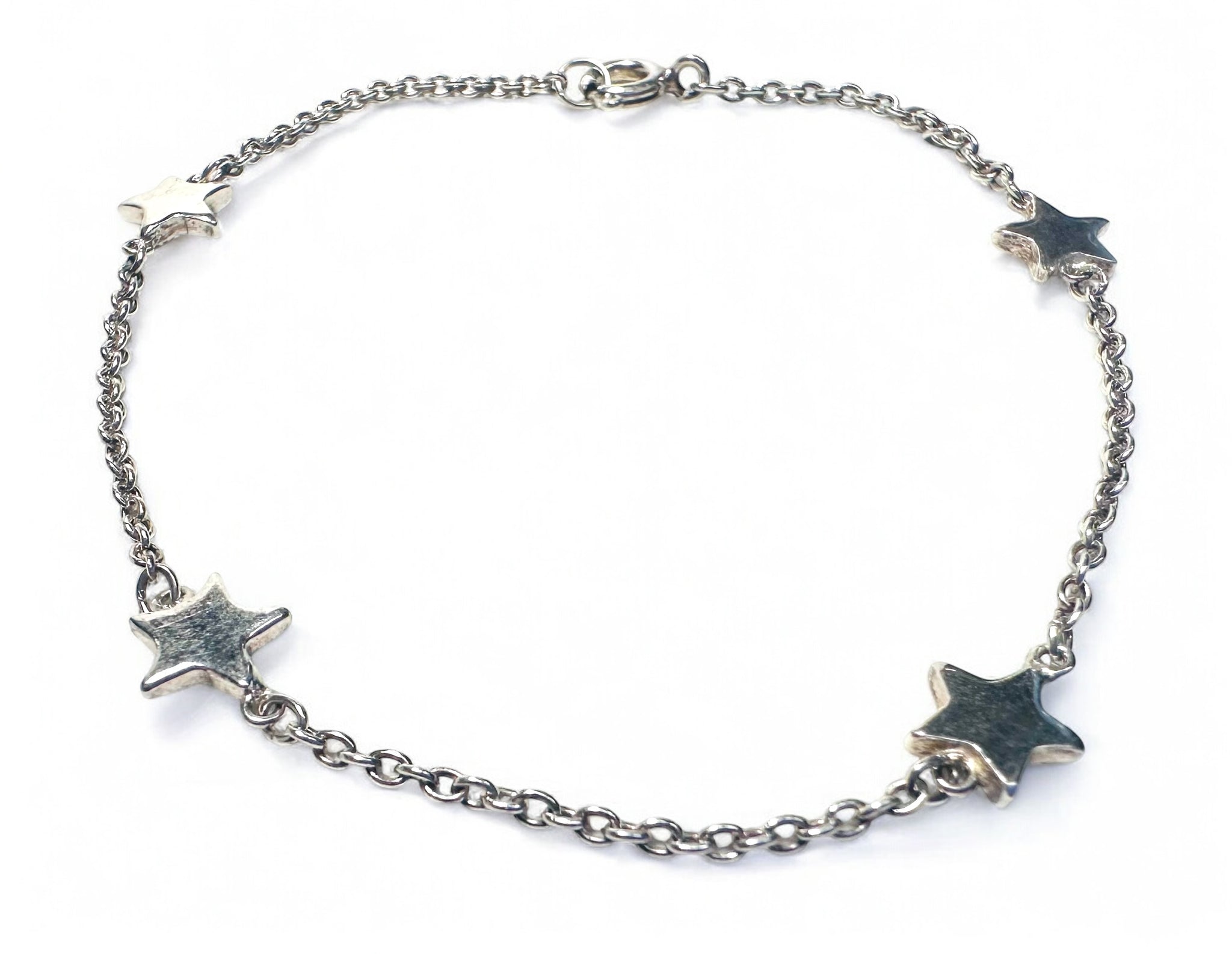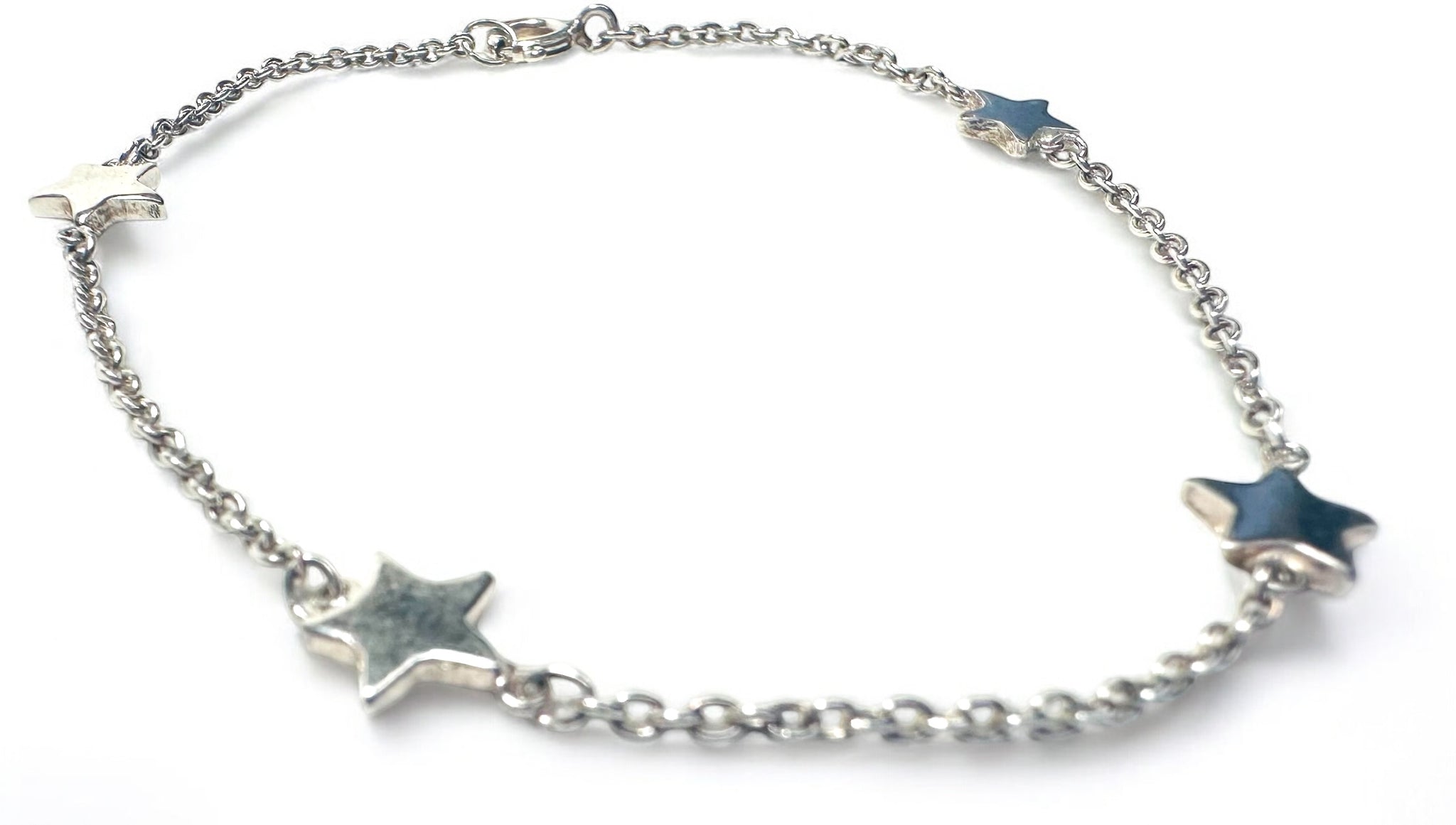 7.5” long . Silver plated chain with 4 silver plated star charms attached. Silver spring ring clasp.  Expertly crafted with a sleek and stylish design, this Silver Star Bracelet measures 7.5 inches in length and features a delicate silver plated chain attached with 4  star charms. The bracelet is finished with a secure silver spring ring clasp, providing both aesthetic appeal and practicality.